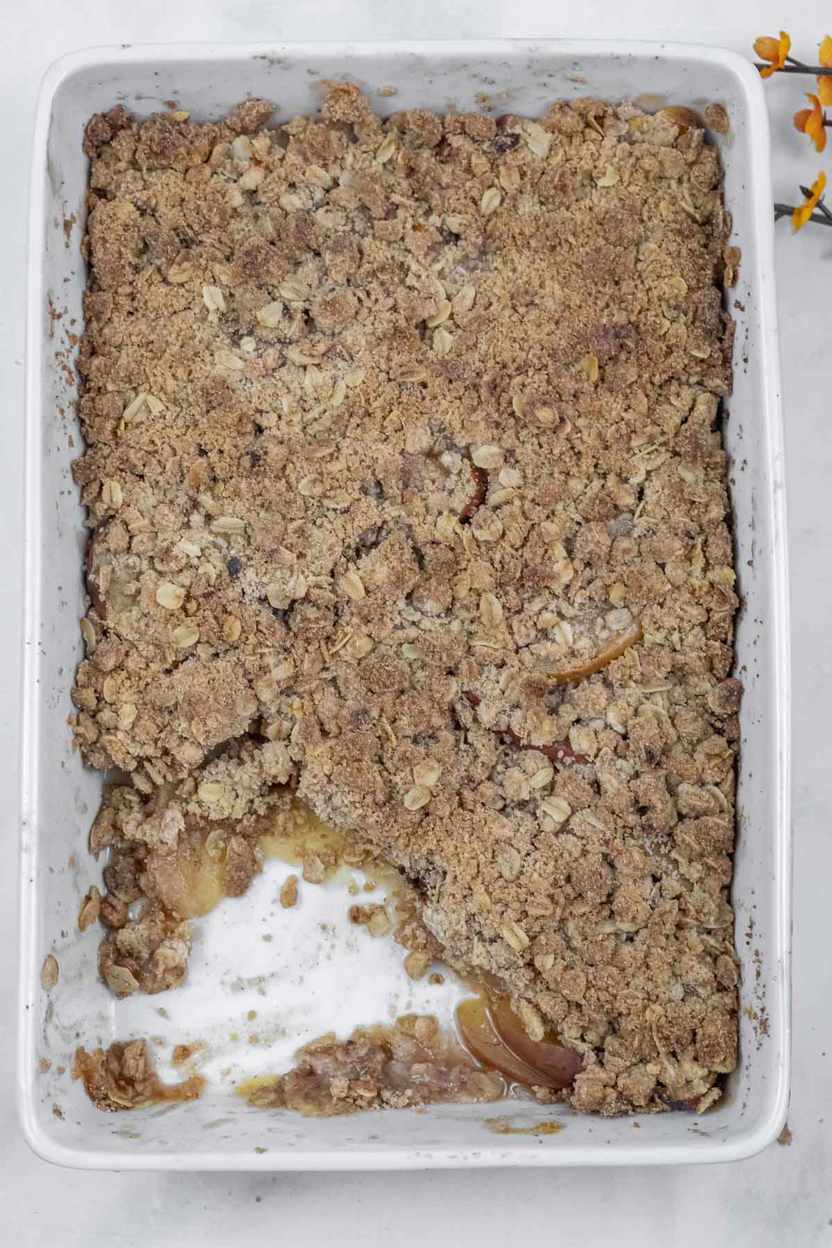 Freeze: Once cooled, cover with plastic wrap first and then a layer of aluminum foil. You can also freeze it before baking. If you do, I would toss the apples in 2 tablespoons of lemon juice before adding the topping to help keep the apples from turning brown.