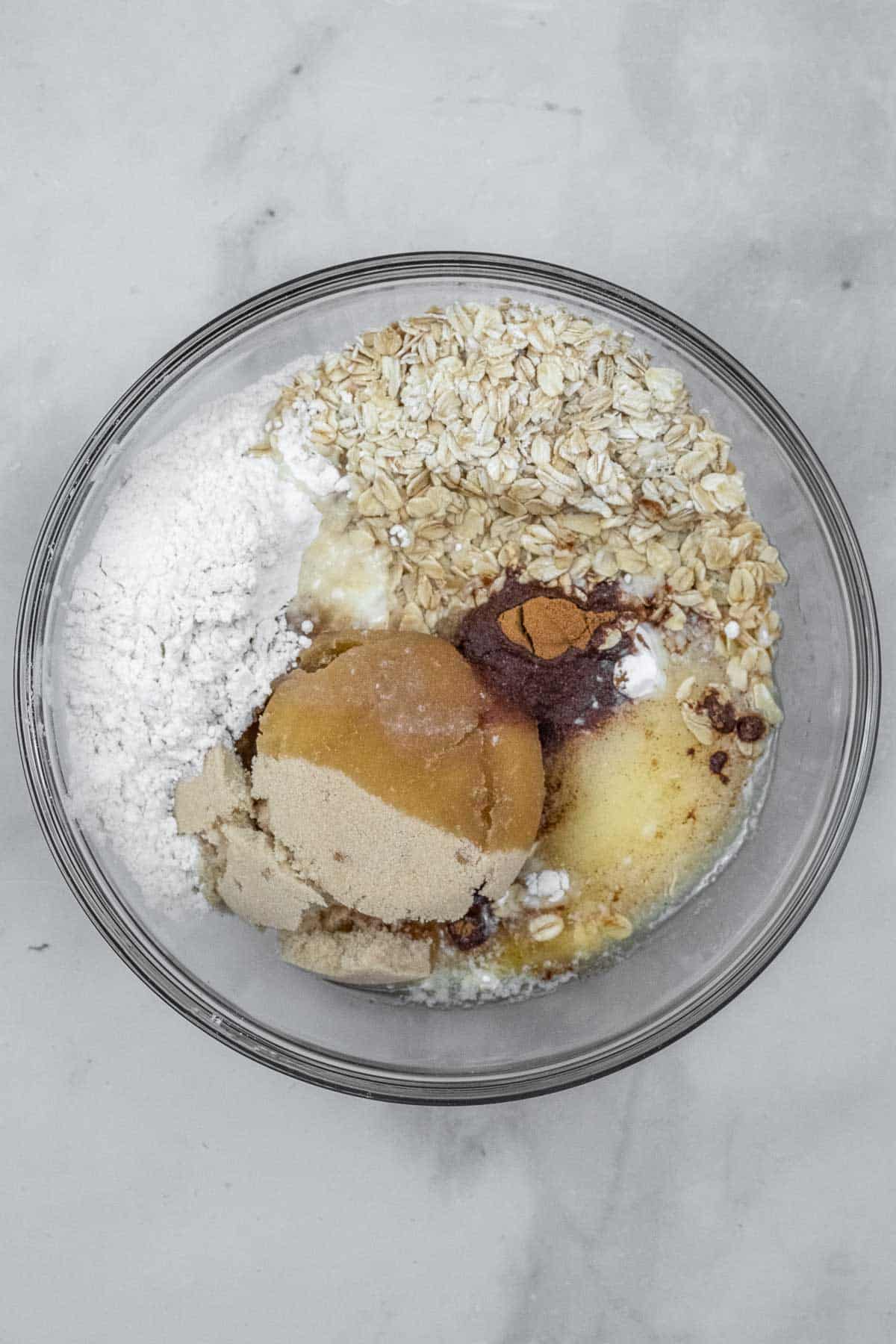 - In a medium bowl, add all of the other ingredients and mix well until the butter has coated all of the dry ingredients well and there are no dry spot remaining.1 cup all purpose flour, ½ cup old fashioned oats, ½ cup brown sugar, ½ cup butter, ¼ cup granulated sugar, 1 tablespoon cinnamon, ½ teaspoon baking powder