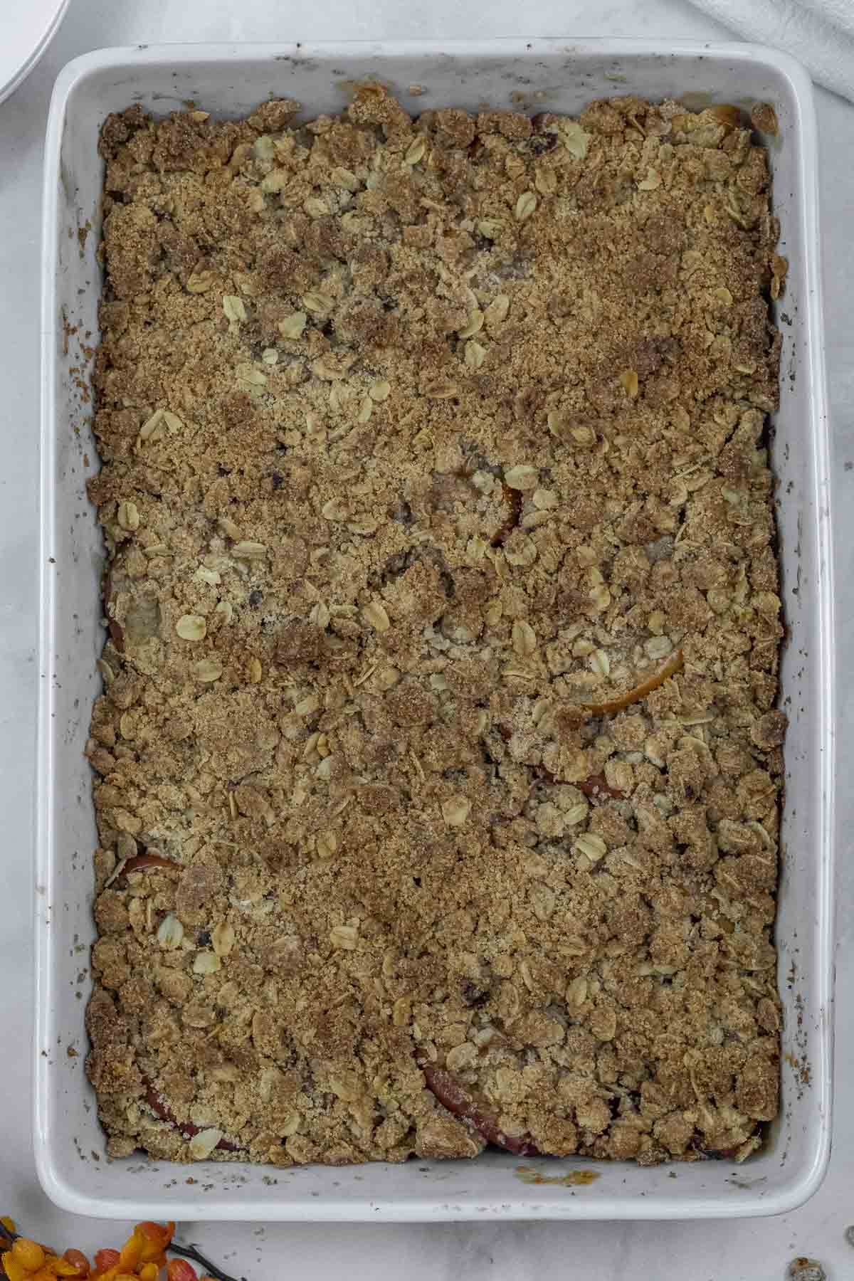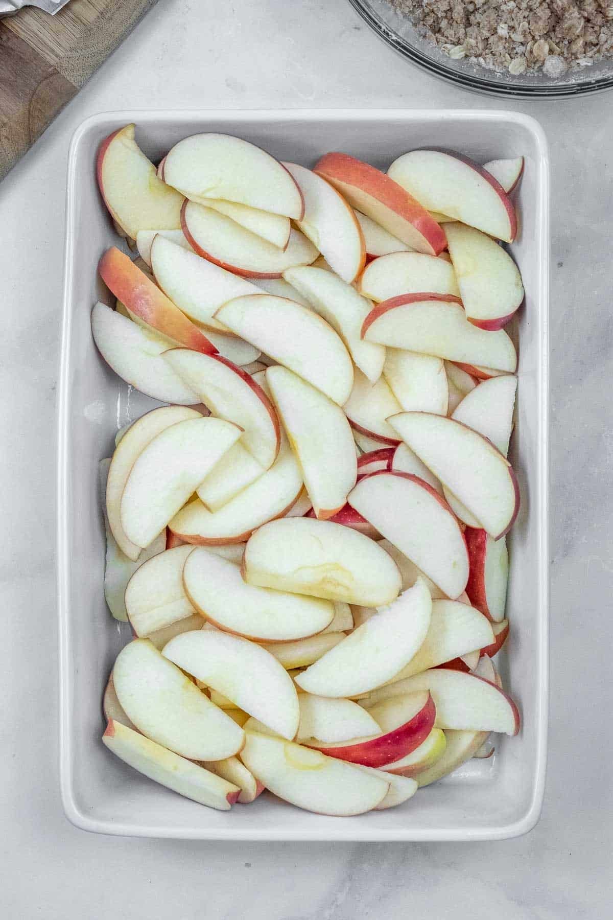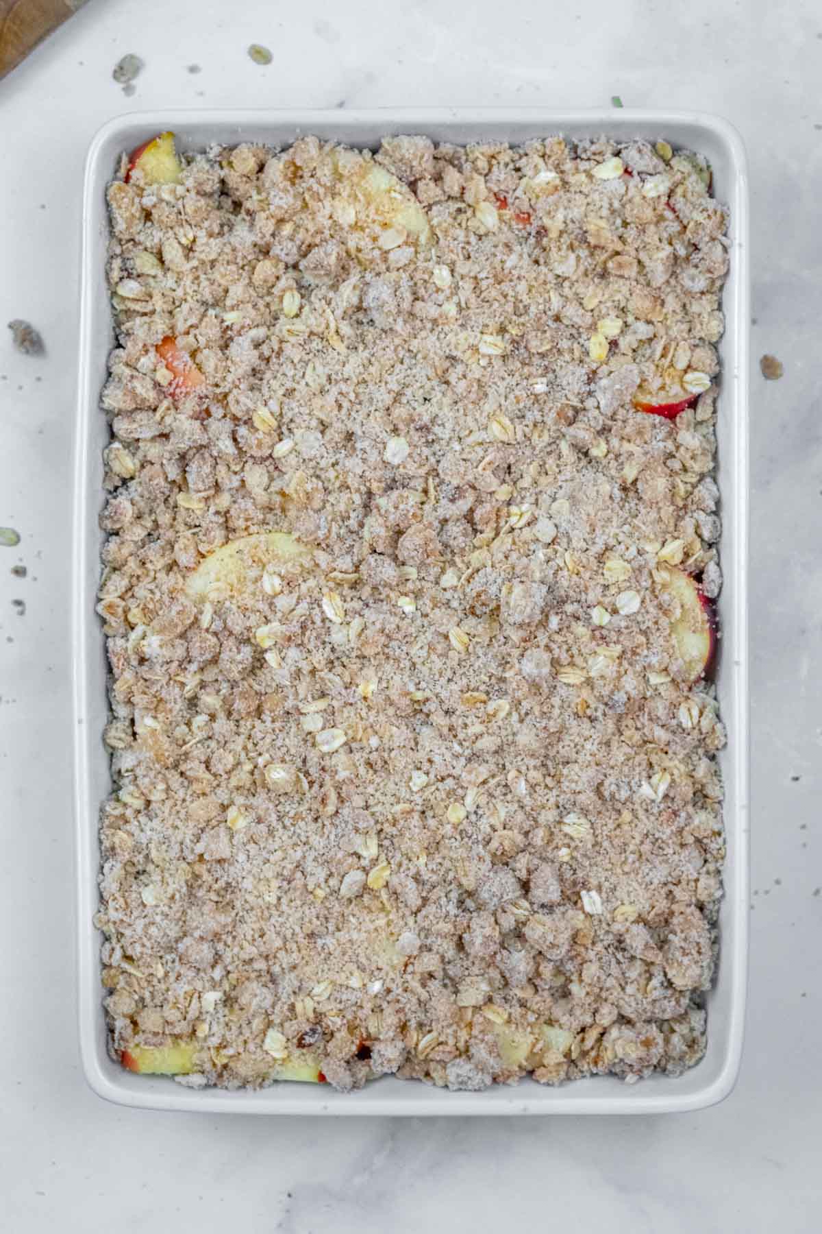 - Sprinkle the flour/oat mixture evenly over top of the sliced apples.