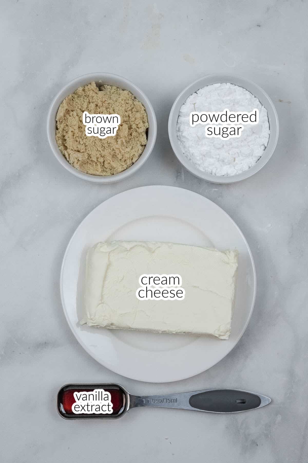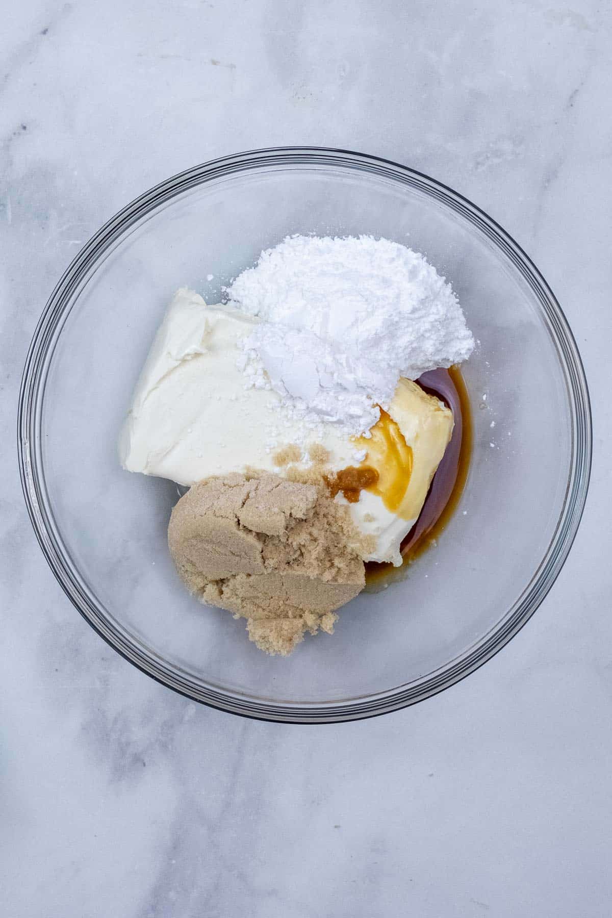 - In a mixing bowl, add the ingredients and blend with an electric hand mixer until mixed together well and smooth.8 ounces cream cheese, ¼ cup brown sugar, ¼ cup powdered sugar, 1 tablespoon vanilla extract