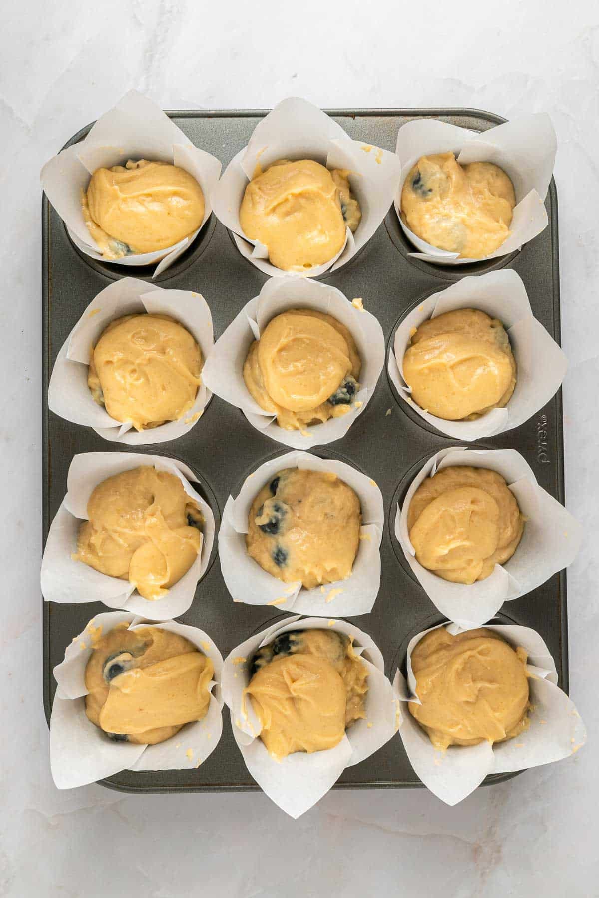 A muffin tin filled with twelve paper liners, each containing unbaked blueberry yogurt muffin batter with visible blueberries.