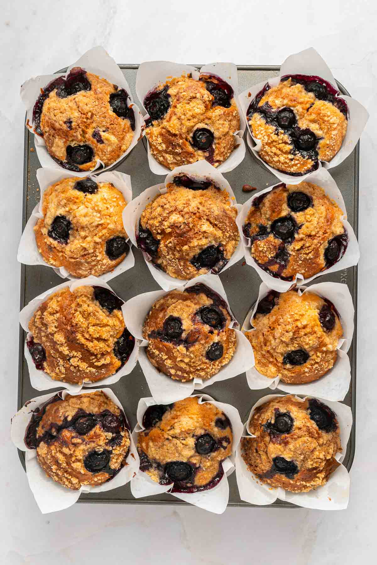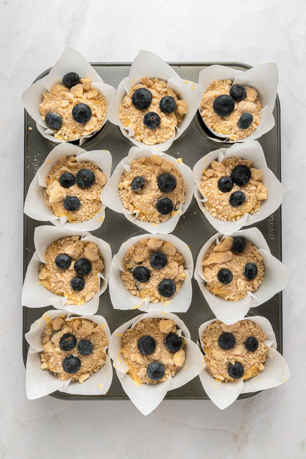 A muffin tin with twelve paper liners holds unbaked muffins topped with blueberries and crumbly streusel on a light surface.