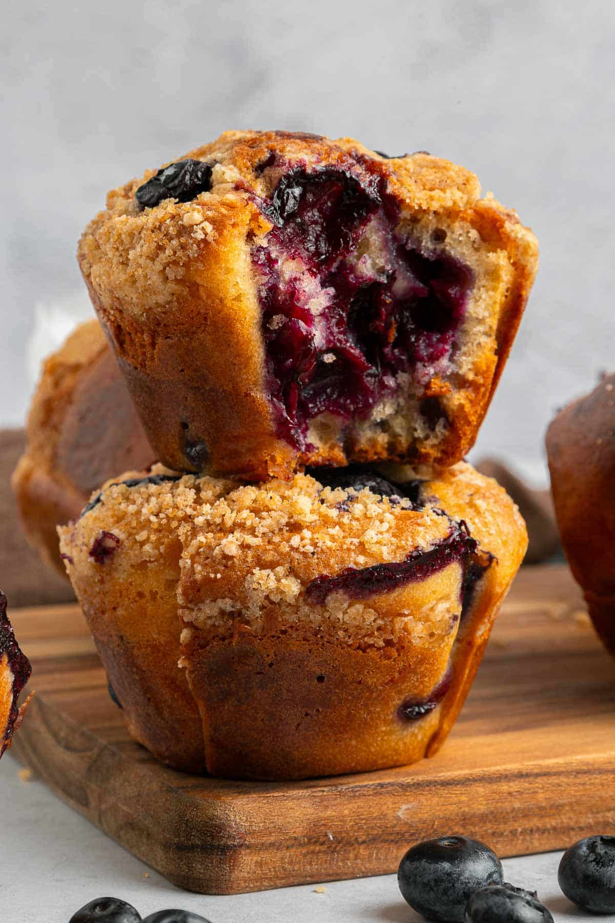 Two blueberry yogurt muffins are stacked on a wooden board; the top muffin is partially eaten, showing a moist interior with visible blueberries.