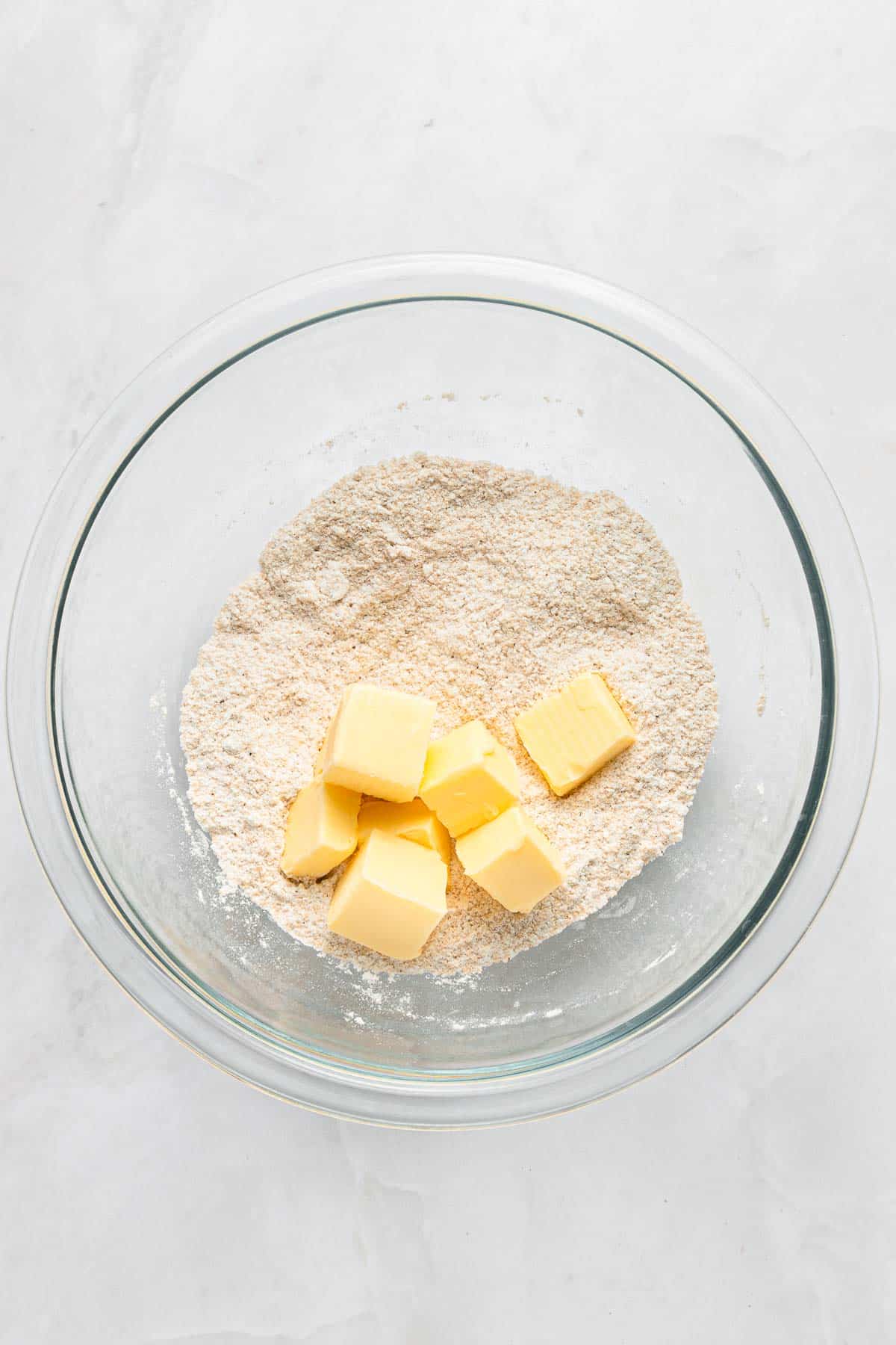 A glass bowl containing flour and several cubes of butter on a light-colored surface.