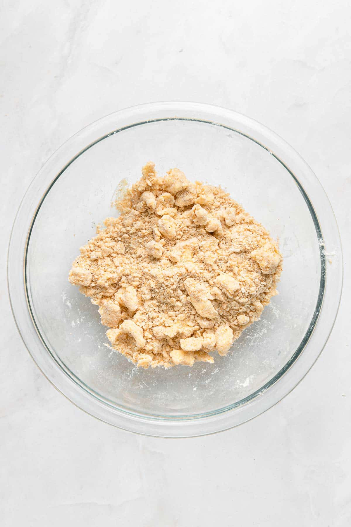 A glass bowl containing a coarse, crumbly dough mixture sits on a white surface.
