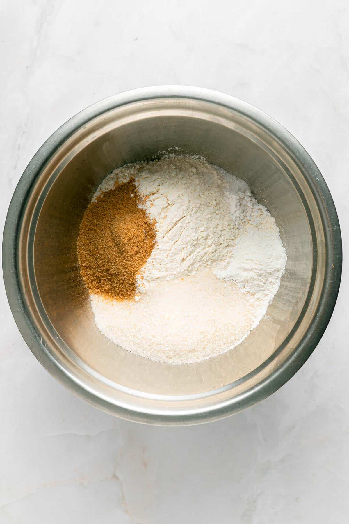 A metal mixing bowl containing white flour, granulated sugar, baking soda, baking powder and brown sugar on a light marble surface.