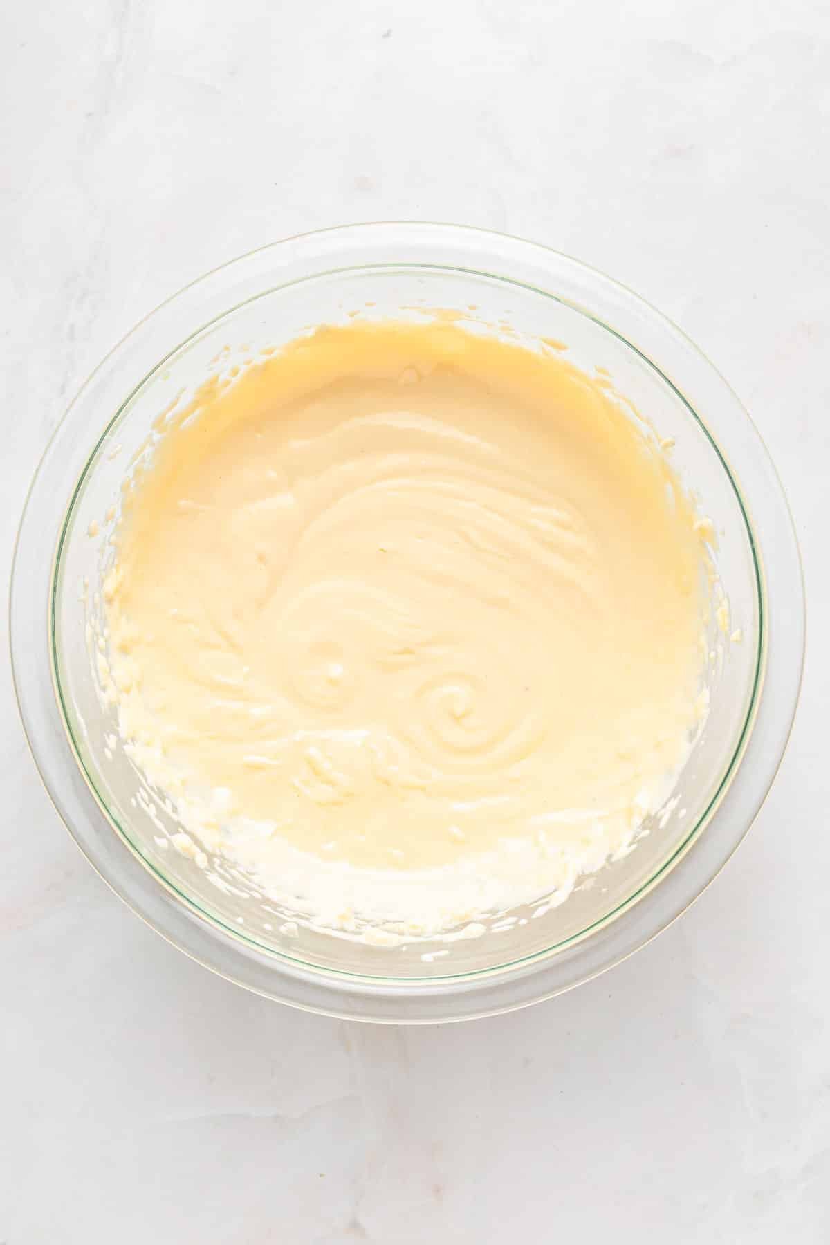 A glass bowl filled with smooth, pale yellow cake batter on a white marble surface.