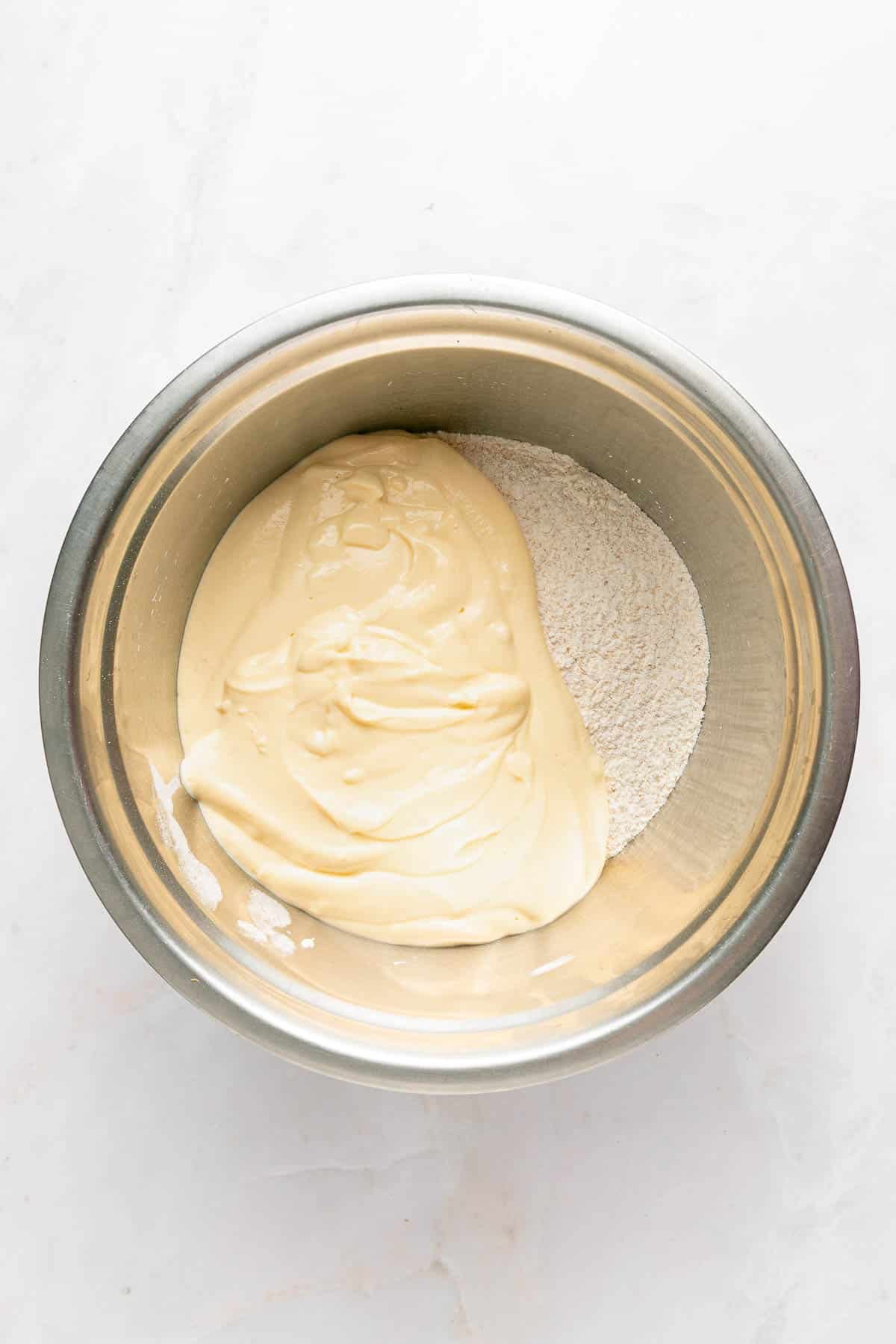 A metal mixing bowl containing flour with a thick, creamy batter added into the bowl on a white surface.