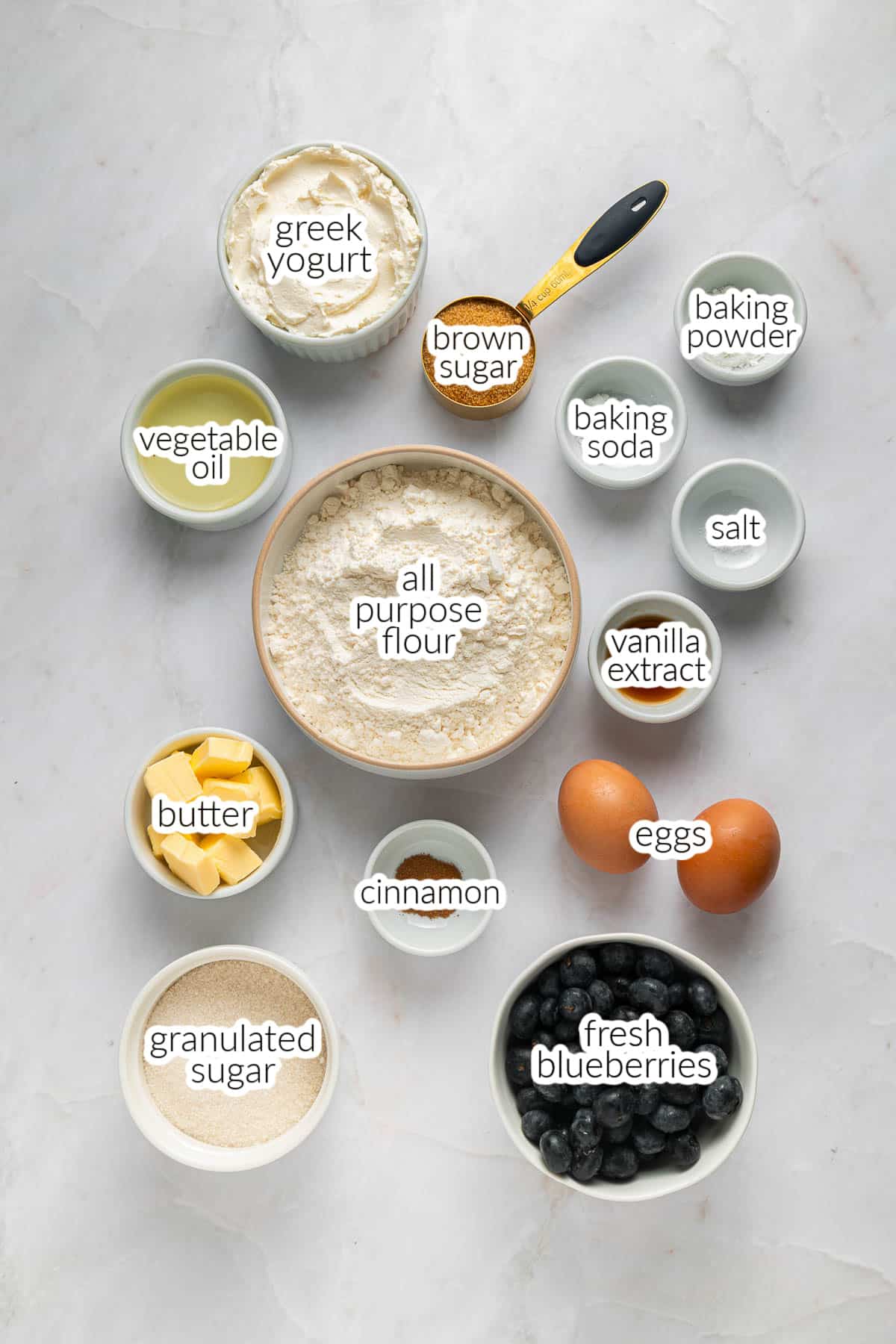 Various baking ingredients for Blueberry Yogurt Muffins including all-purpose flour, greek yogurt, brown and granulated sugar, baking powder, baking soda, salt, vegetable oil, butter, cinnamon, vanilla, eggs, and blueberries.