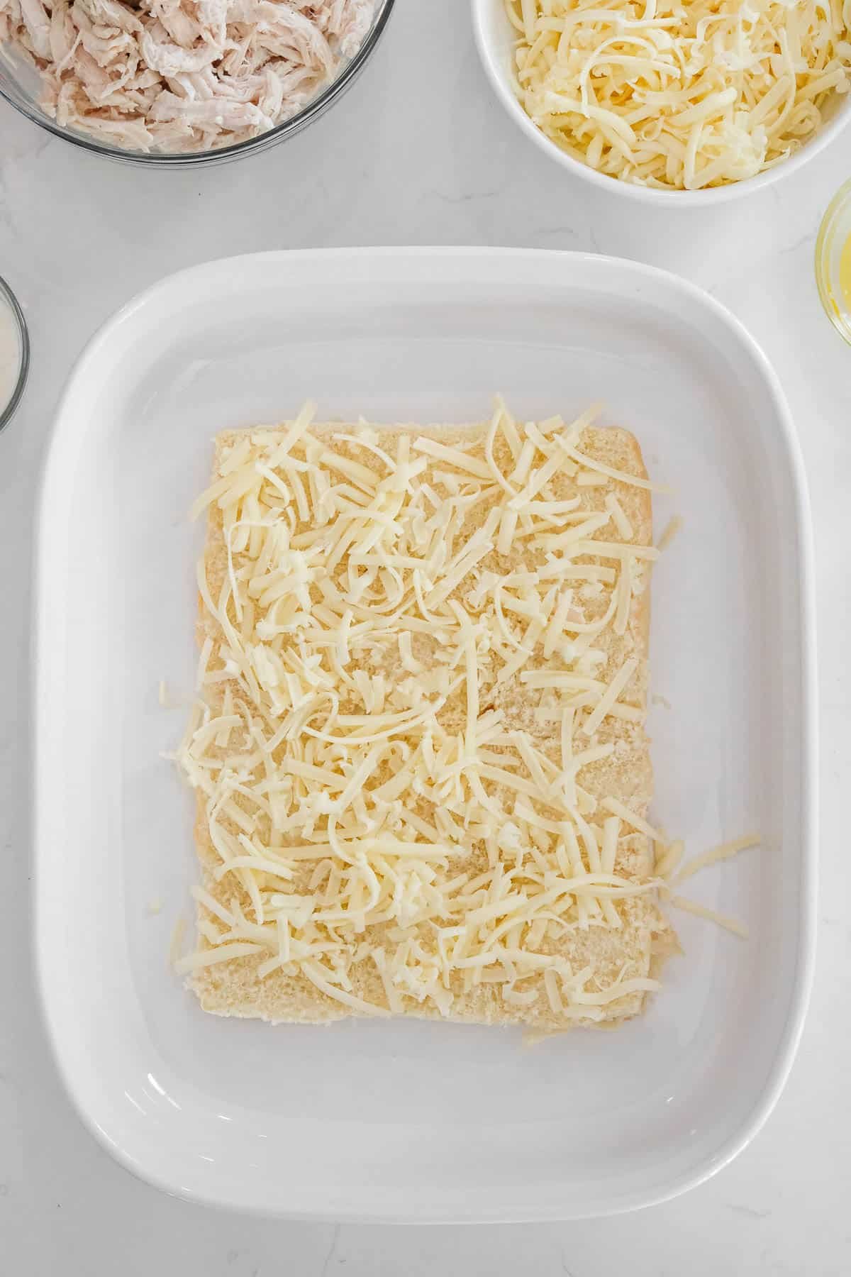 - Next, spread the chicken mixture over the cheese.