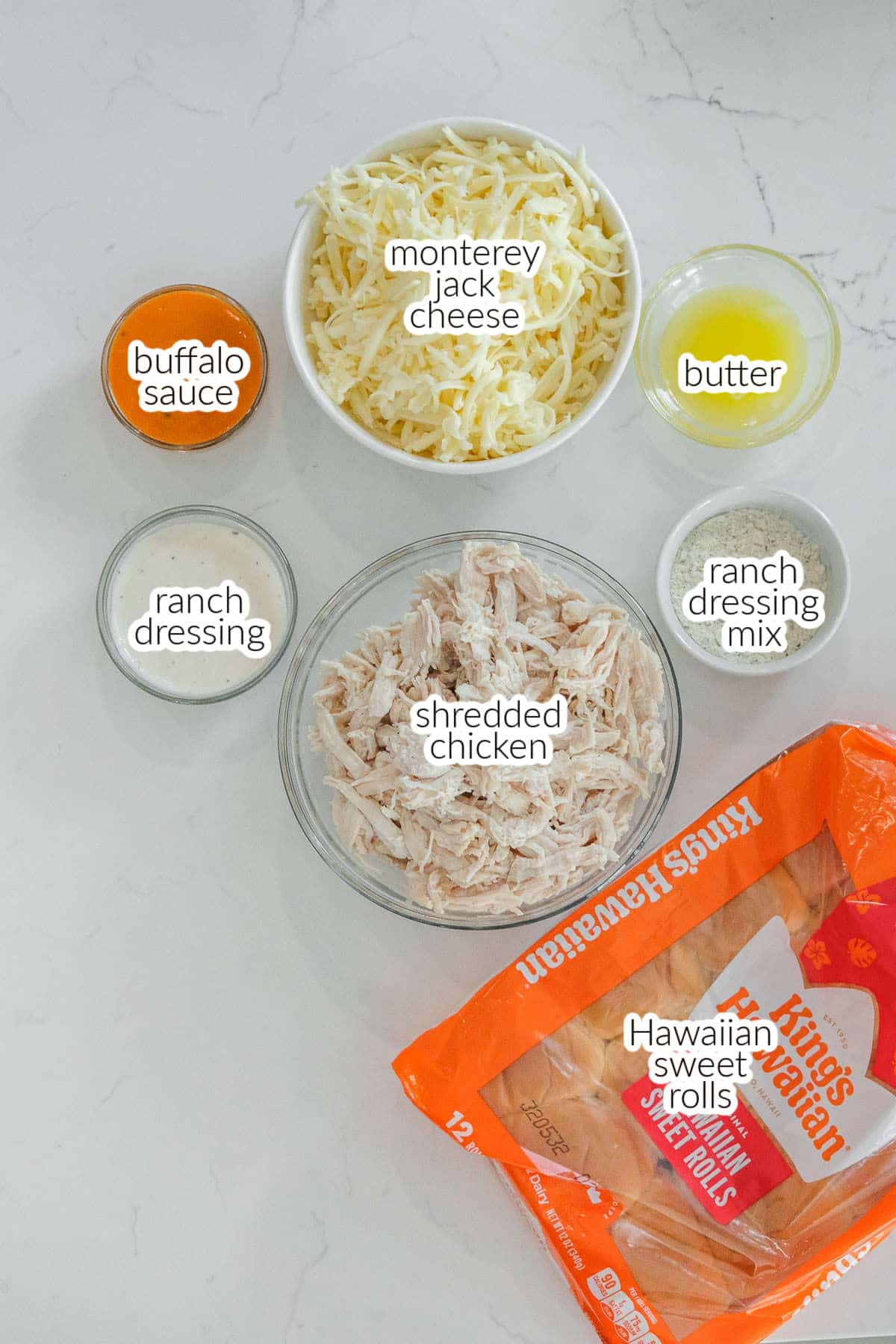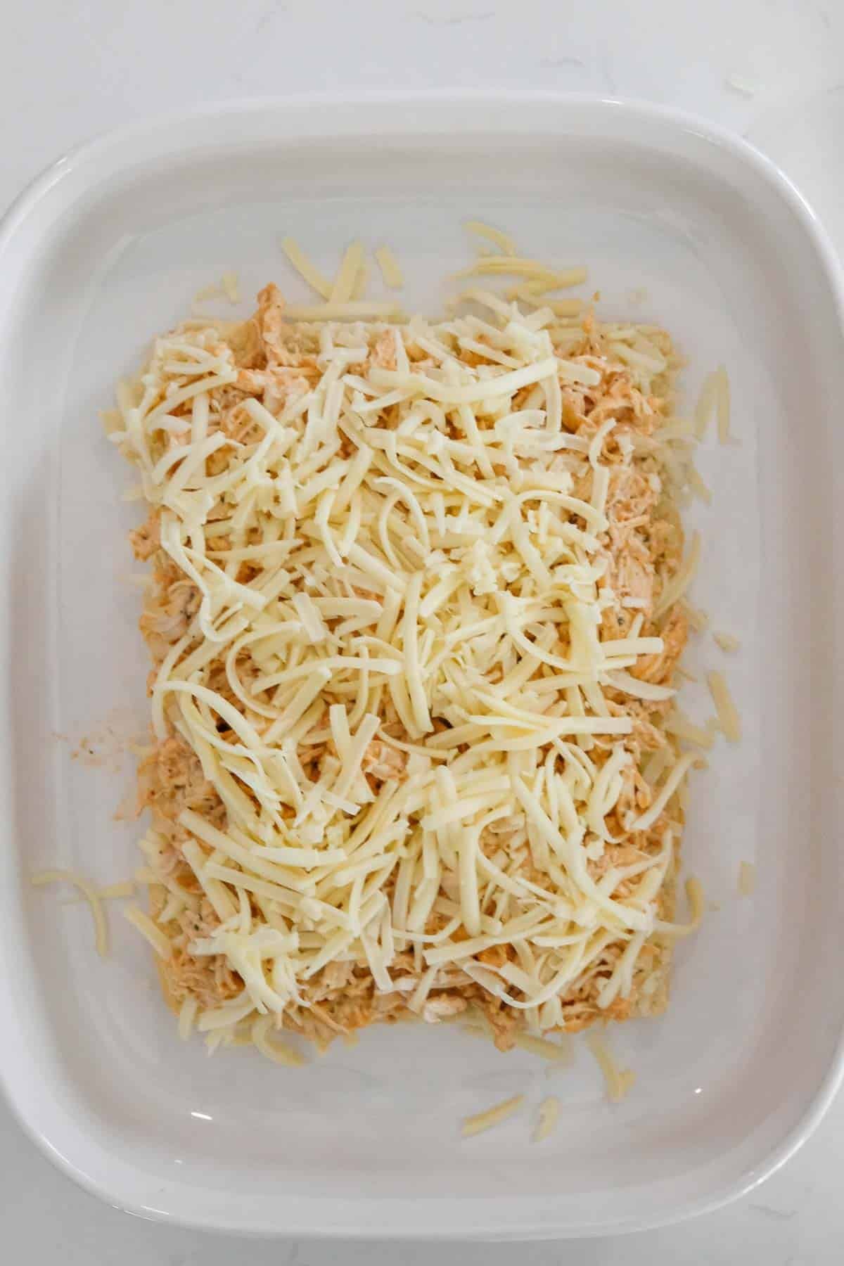 - In a medium bowl, add the shredded chicken, buffalo sauce, ranch dressing, and all but a teaspoon of the dry ranch dressing mix in a large bowl until evenly coated.8 ounces Monterey Jack cheese, 3 cups finely shredded cooked chicken breast, ¼ cup buffalo sauce, ¼ cup ranch dressing, 3 tablespoons ranch dressing mix