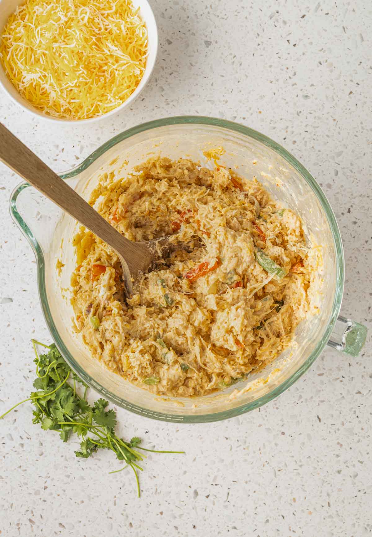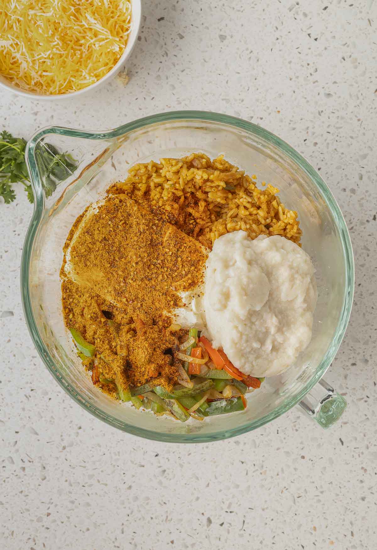 - In a large bowl, add the cooked, shredded chicken, cooked rice, cream of chicken soup, cream cheese, fajita seasoning, sautéd peppers and onions, and one cup of shredded cheese. Stir until all the ingredients are combined well.1 ½ pounds chicken, 21 ounces cream of chicken soup, 8 ounces cream cheese, 3 tablespoons fajita seasoning, 2 cups shredded Mexican blend cheese