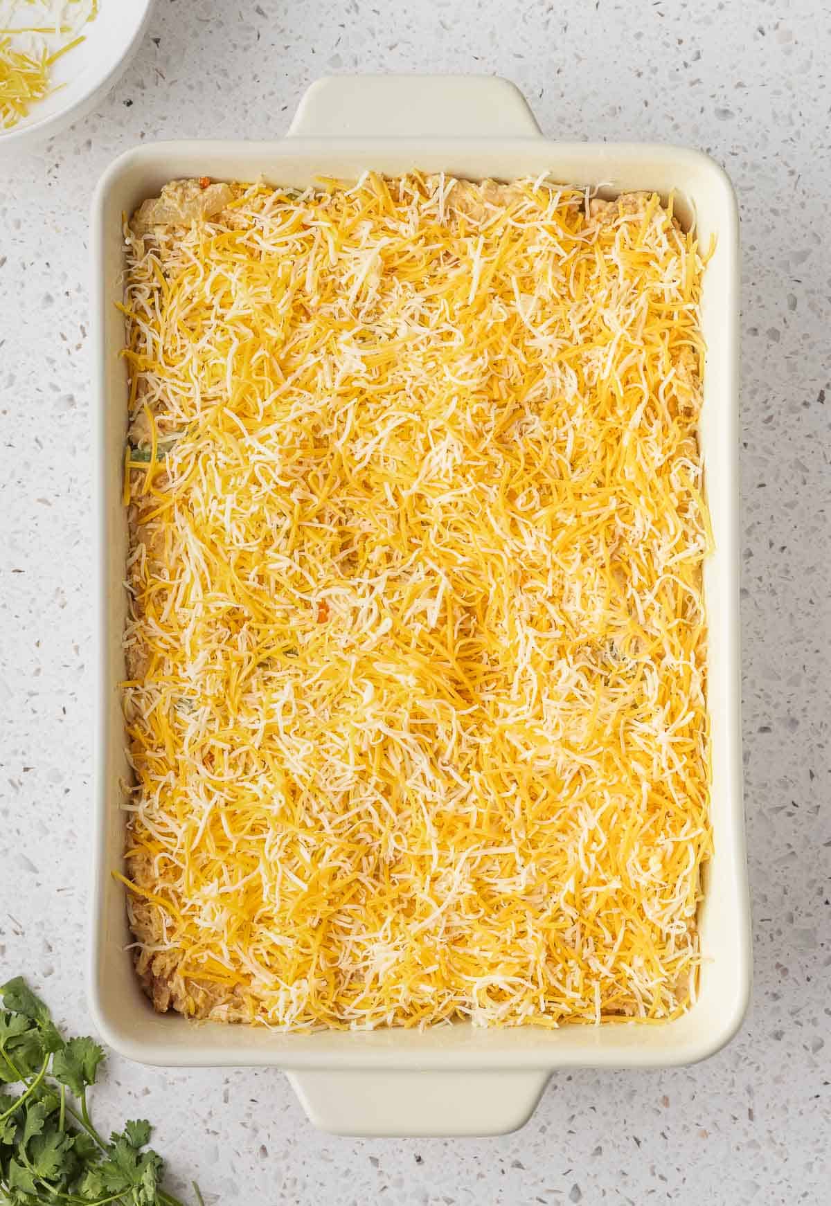 - Shredded Mexican blend cheese – I like to shred my own so it’s extra creamy. Some goes into the casserole mixture and the rest gets sprinkled on on top. Swap with another cheese like any cheddar cheese, Monterey Jack, colby jack, or pepper jack or a combination of a few as long as you have about 2 or so cups. Feel free to add more cheese of course.