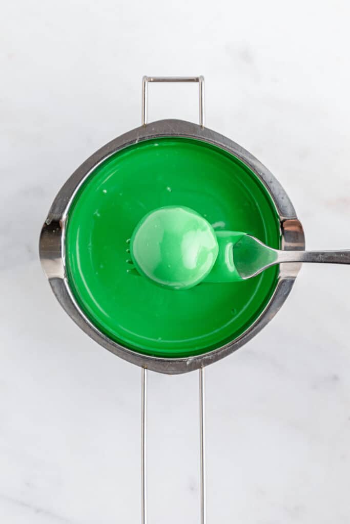 - In a double boiler, add the green candy melts and heat over low heat and melt them, stirring often, until smooth. Do not heat too high or it will thicken and be unusable.10 ounce green candy melts