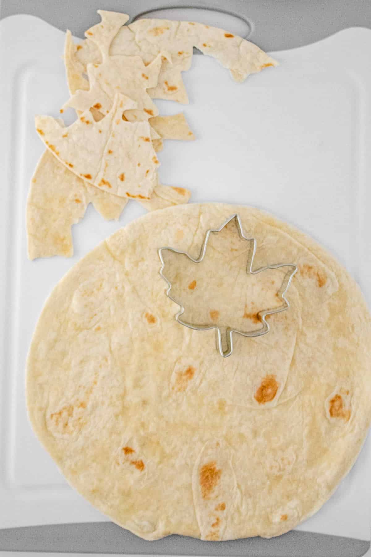 Step 4: Lay tortillas out on a cutting board and cut shapes with cookie cutters (I love the cut leaf shapes for fall holidays) or use pizza cutter or sharp knife and cut each tortilla into 8 triangles. (I cut them in half first then cut each half in half. Then repeat again by cutting those in half).