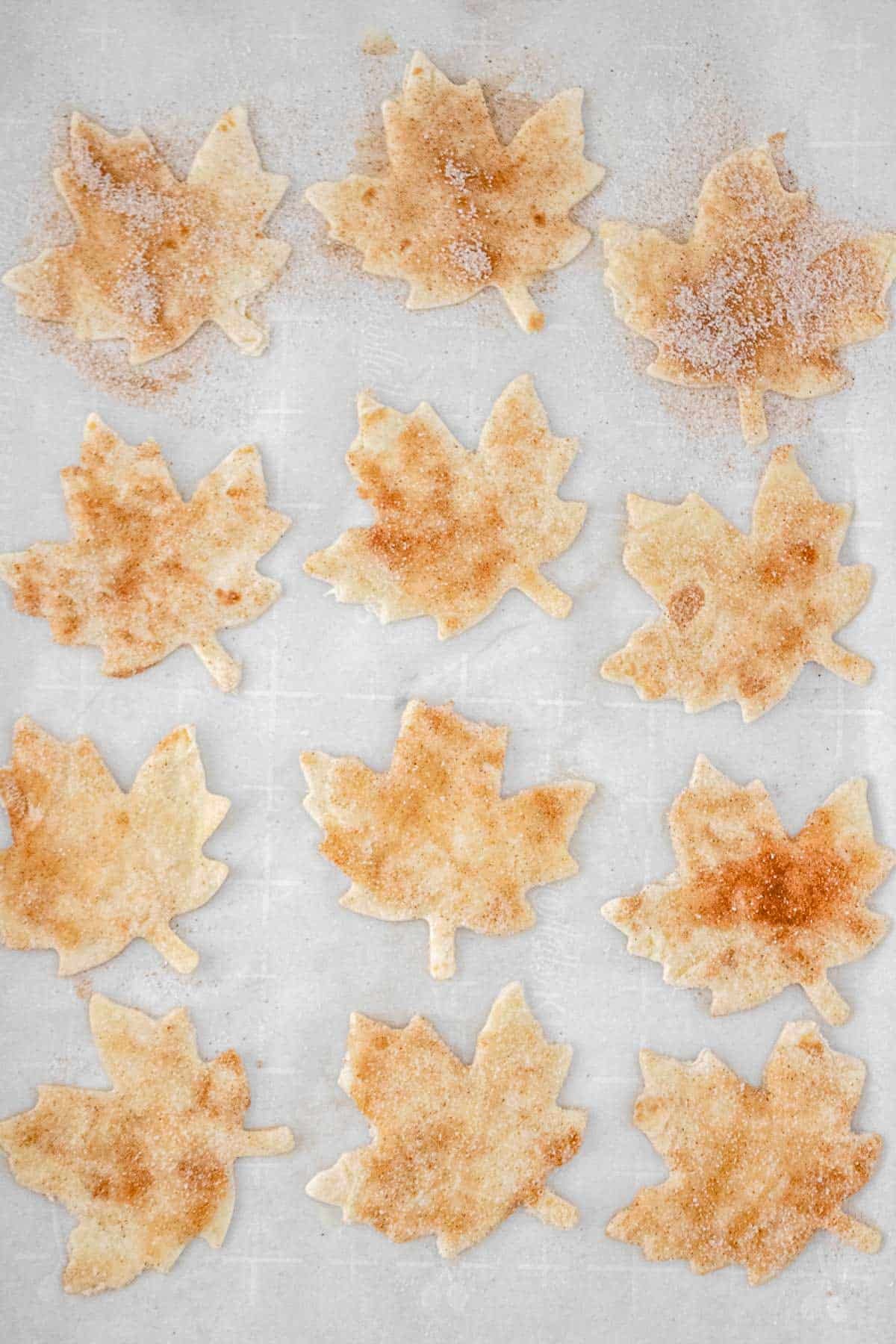 Then flip the tortilla pieces over and lightly brush with butter on this side as well and sprinkle the cinnamon sugar mixture over again. Return to the oven and bake for an additional 7-8 mins until crisp.