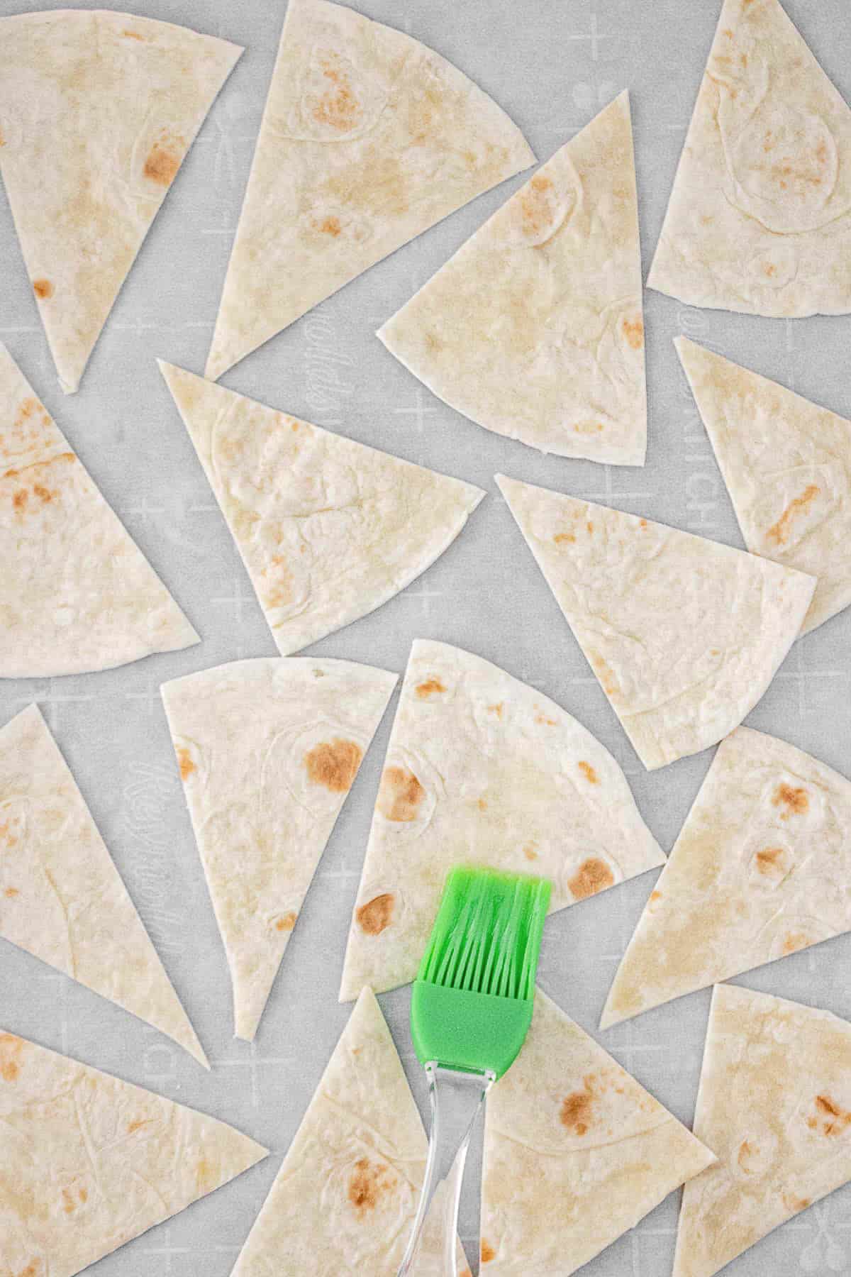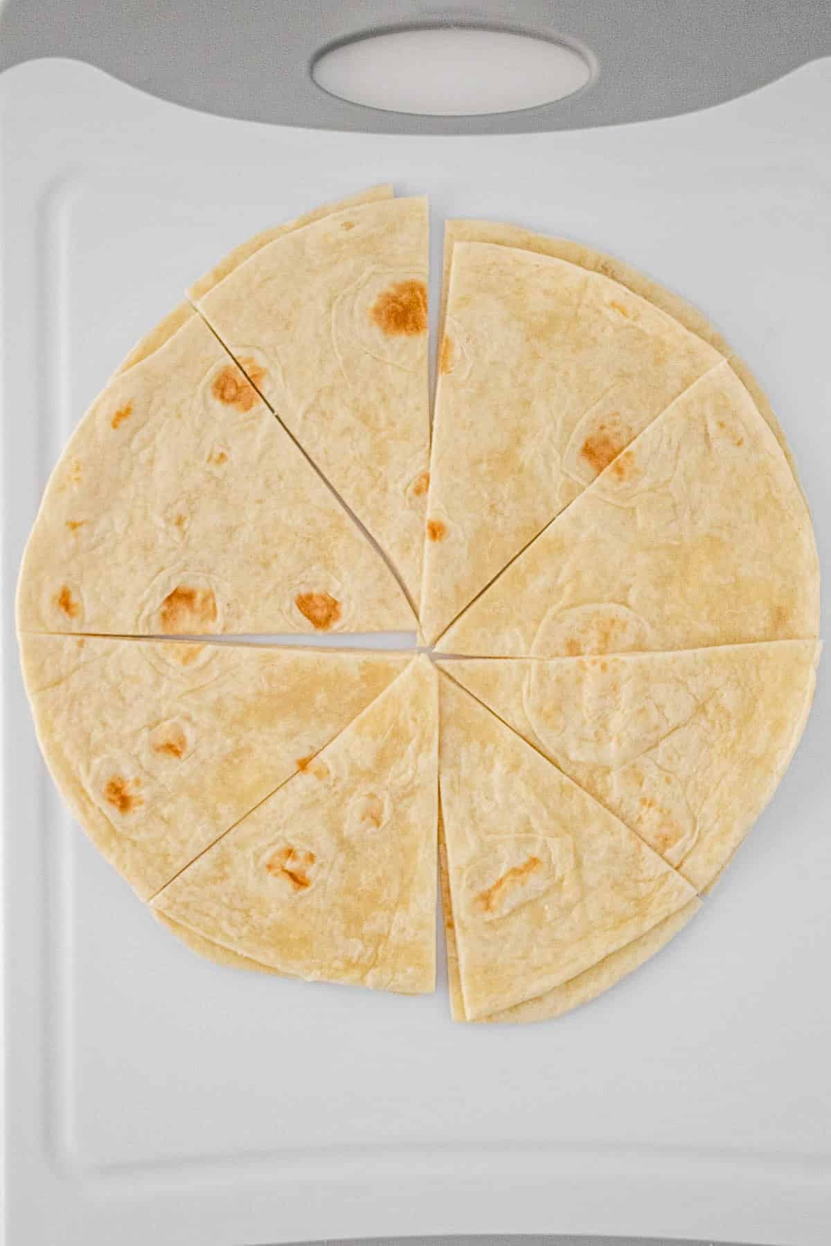 - Lay tortillas out on a cutting board and cut shapes with cookie cutters or use pizza cutter or sharp knife and cut tortilla into small triangles.6-8 medium flour tortillas