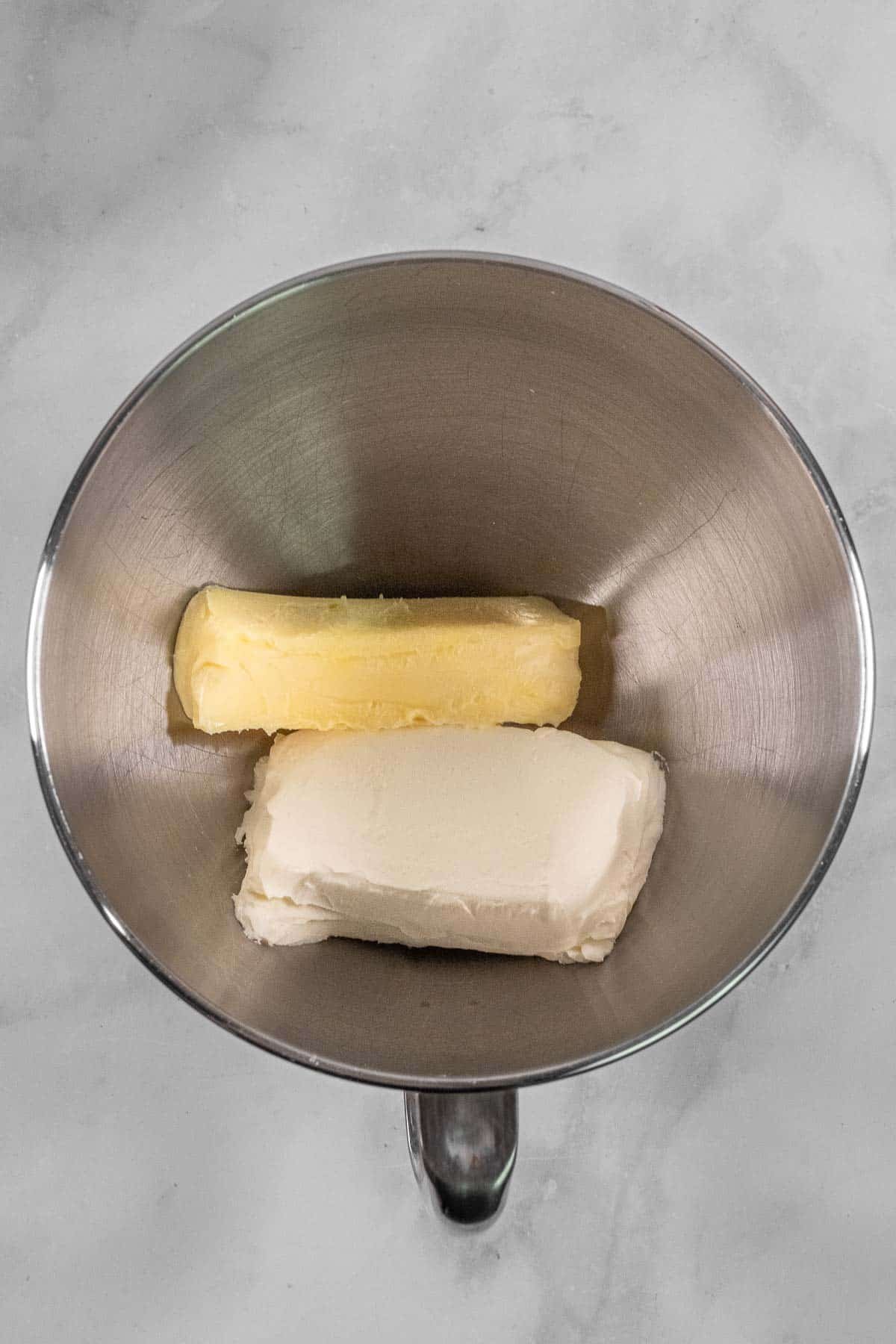 - In a mixing bowl, add the softened butter and cream cheese and mix with a stand mixer or an electric hand mixer for one minute until fluffy and smooth.½ cup unsalted butter, 8 ounces cream cheese