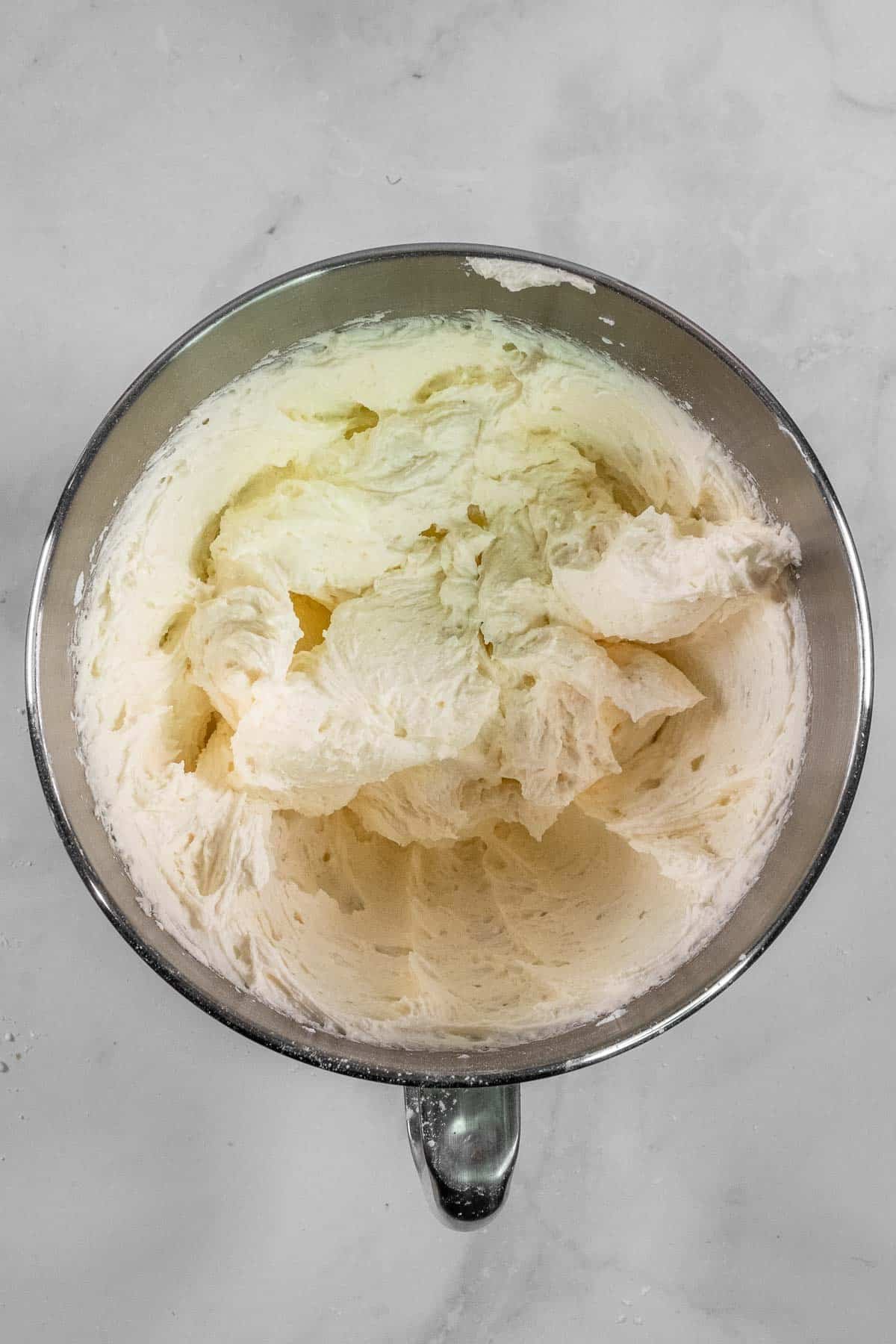 Step 1: In a large bowl, add the softened butter and cream cheese. Beat with a stand mixer with the paddle attachment (or use an electric hand mixer) on medium speed for about 1 minute until it’s light and fluffy.