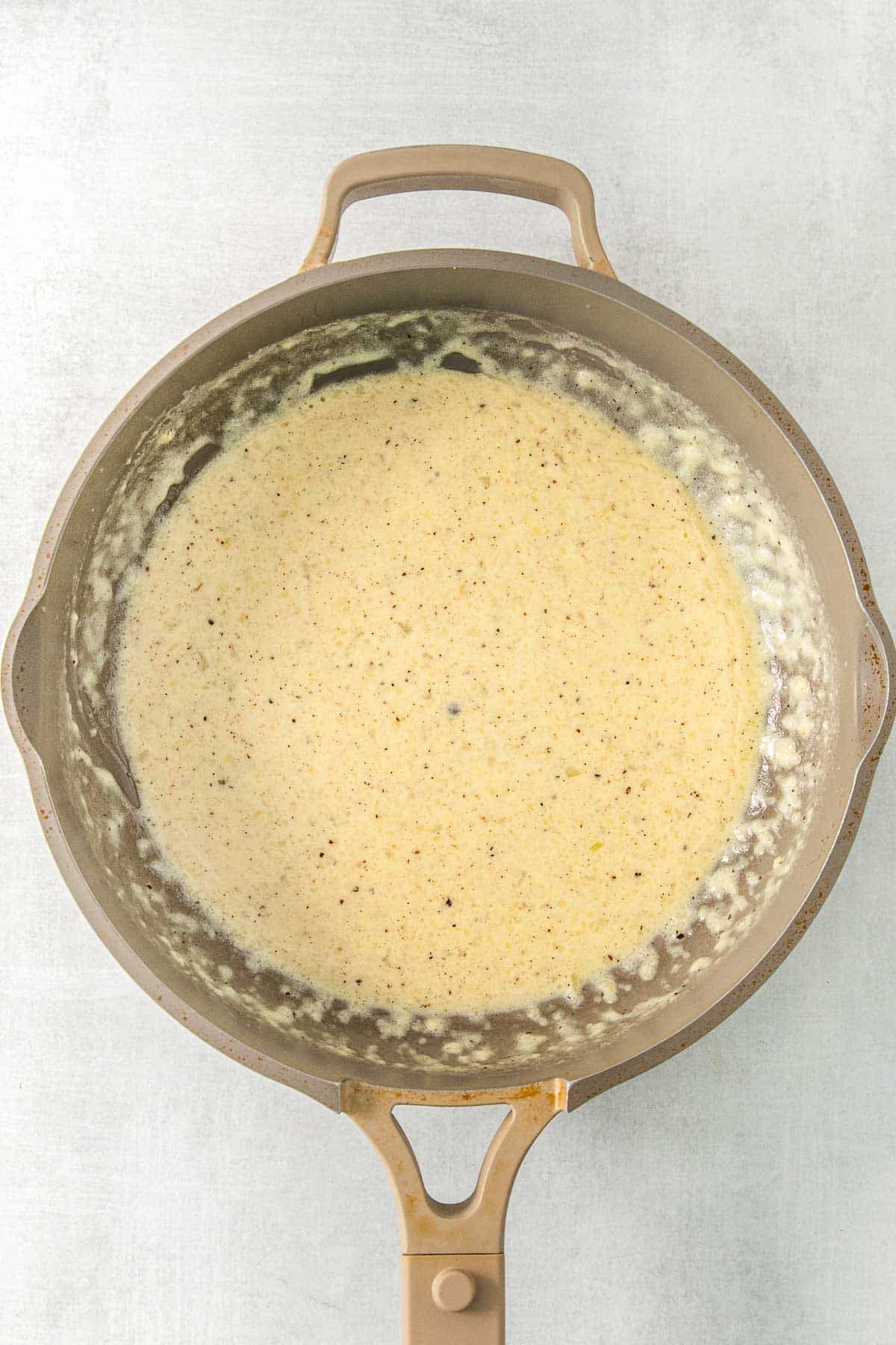 Step 3: Reduce the heat to low and gradually add the grated Parmesan cheese as you whisk continuously until creamy and smooth. Remove from the heat and sprinkle in the black pepper, nutmeg, and salt. Stir to combine.