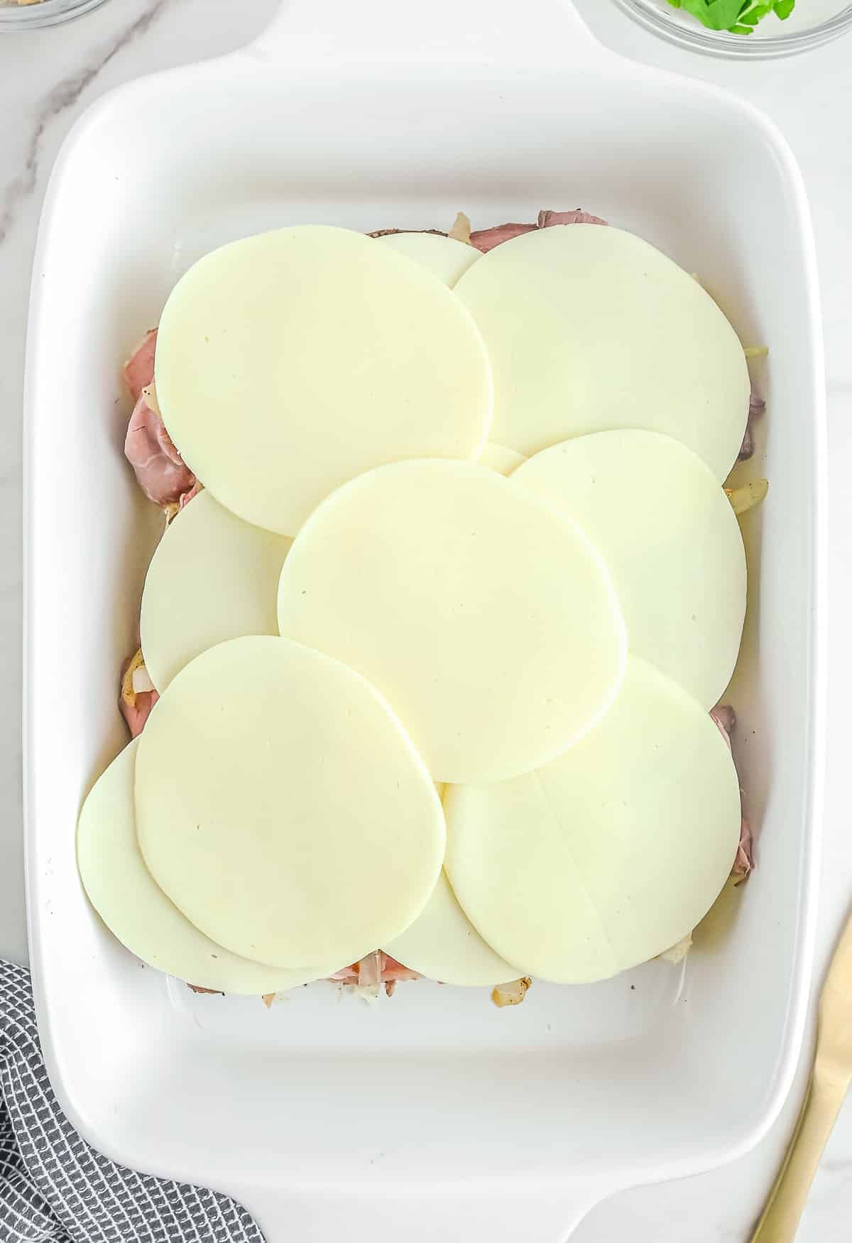 - Then layer the sautéd onions and then place the provolone cheese over top of the cooked onions.12 slices provolone cheese