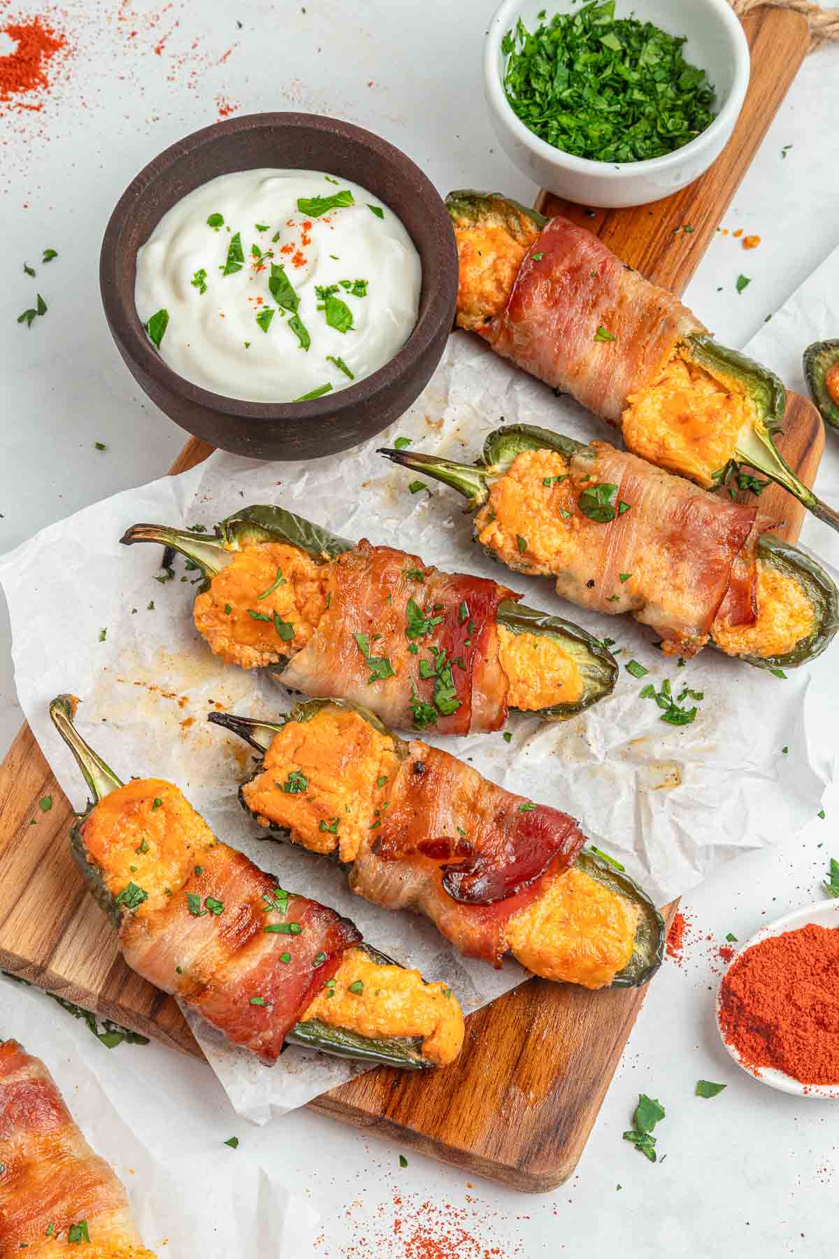 Step 4: Wrap a half slice of bacon around each stuffed jalapeño. (you can secure it on with a toothpick if you’d like.)