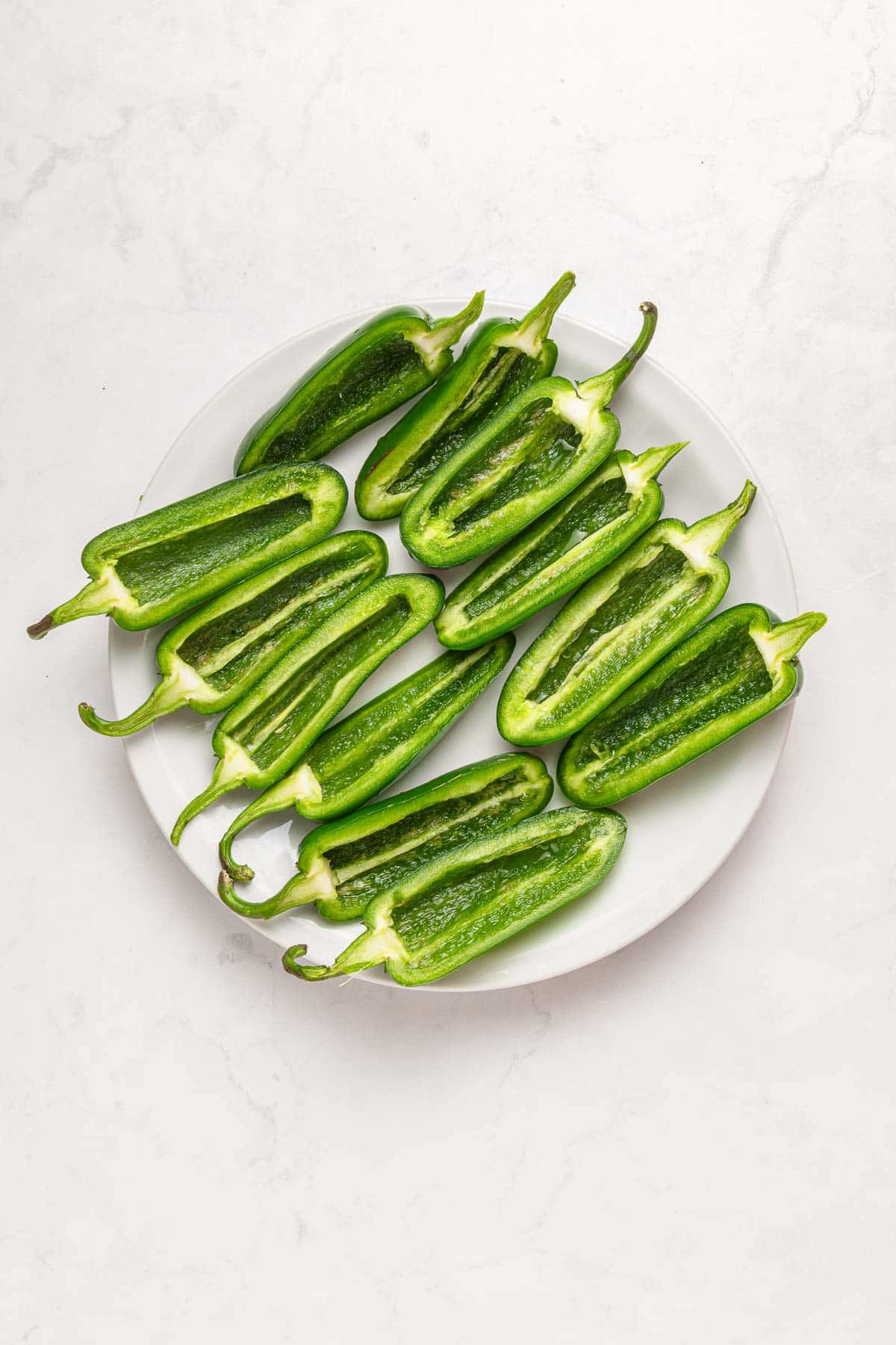 Step 1: Cut the jalapeños in half lengthwise and remove the membranes and seeds. Feel free to cut the stem off as well if you prefer.