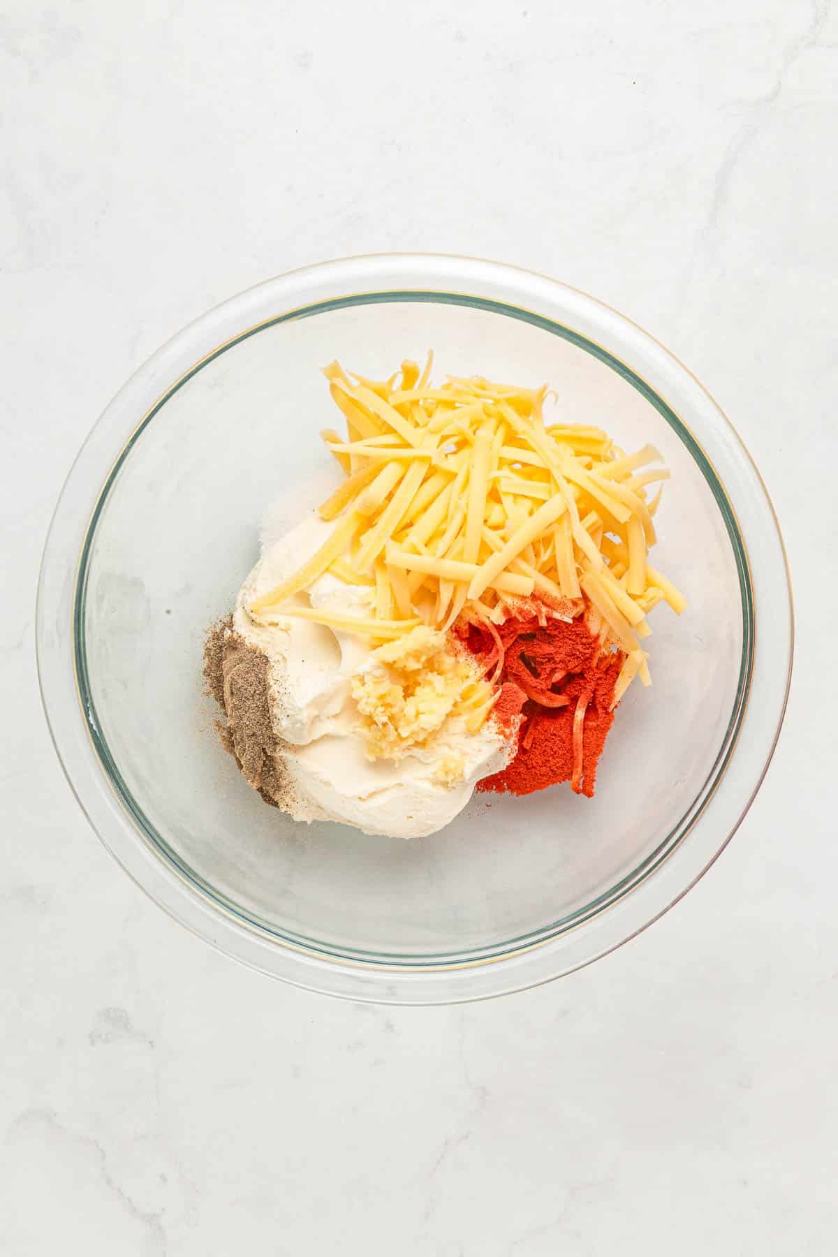 Step 2: In a medium mixing bowl, add the softened cream cheese, shredded cheese, minced garlic, paprika, salt, and pepper. Blend until smooth.