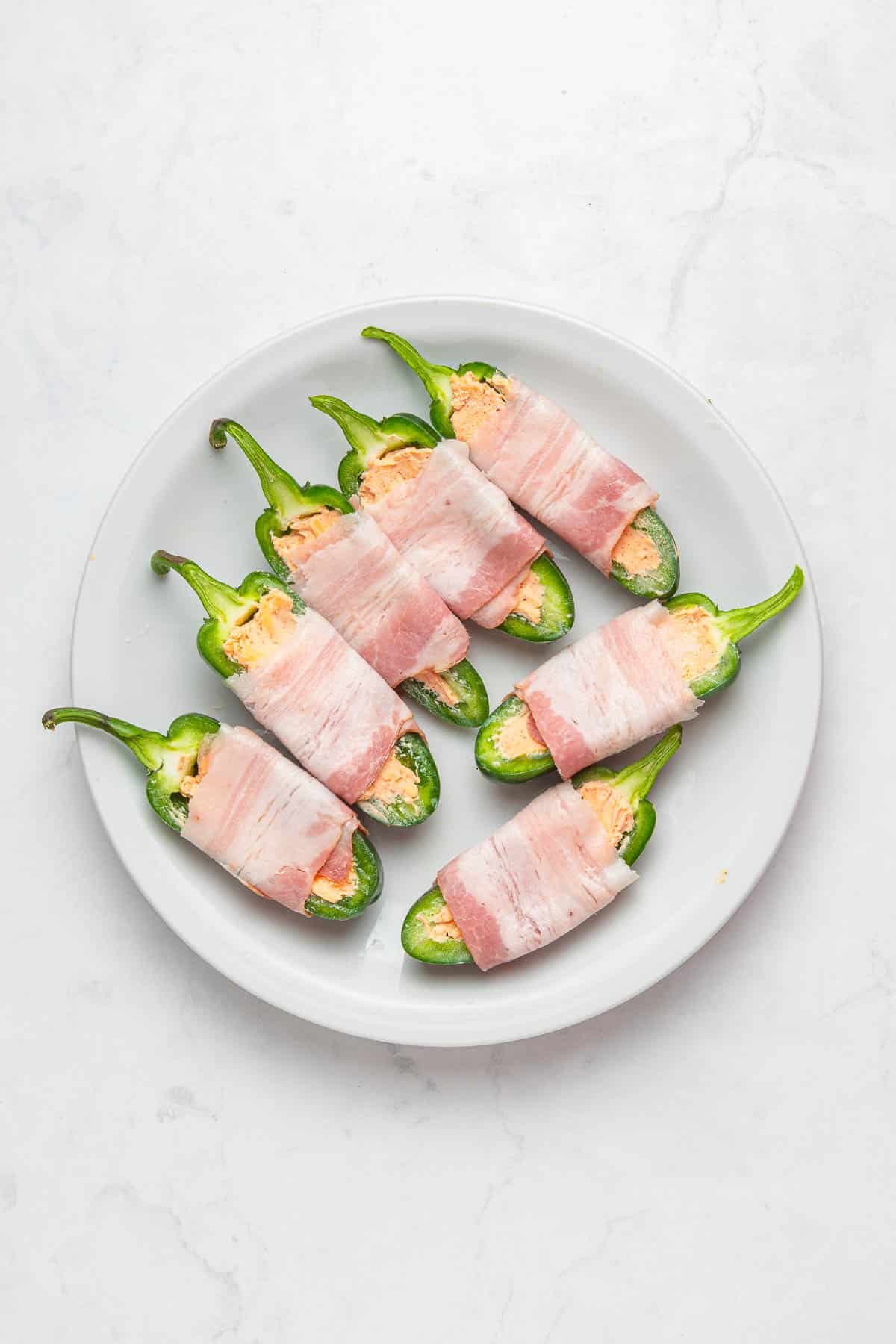 - Then wrap each stuffed jalapeño with a half-slice of raw bacon.6 slices thin cut bacon