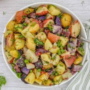This no mayo potato salad recipe is a wonderful twist on classic potato salad for side dish to any meal. Instead of mayonnaise, this recipe is tossed with oil and vinegar dressing, chopped bacon, green onions, and fresh herbs. It’s a perfect potato salad for any occasion.