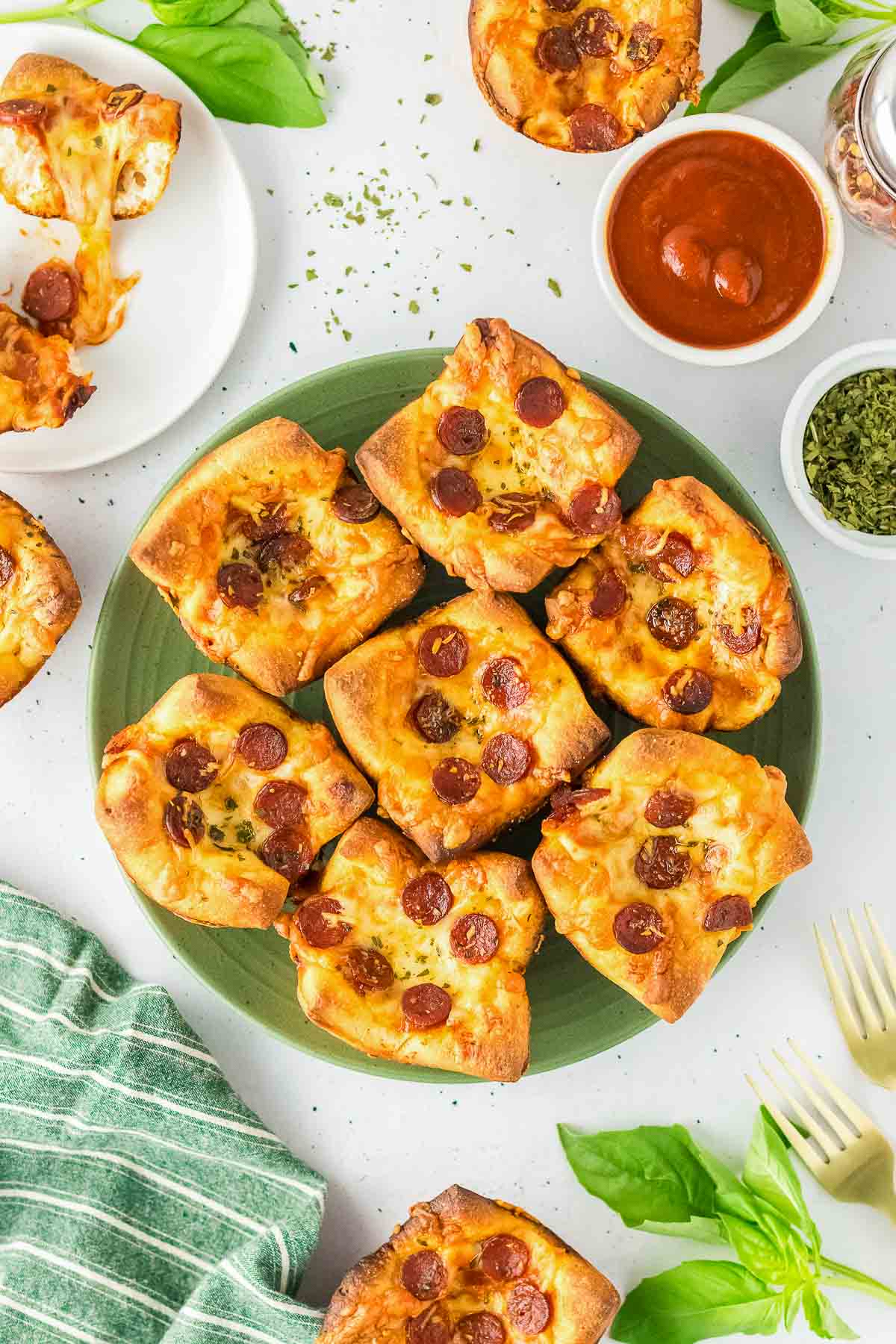 A green plate with pizza muffins, surrounded by bowls of sauce, herbs, a striped napkin, and fresh basil on a white surface.