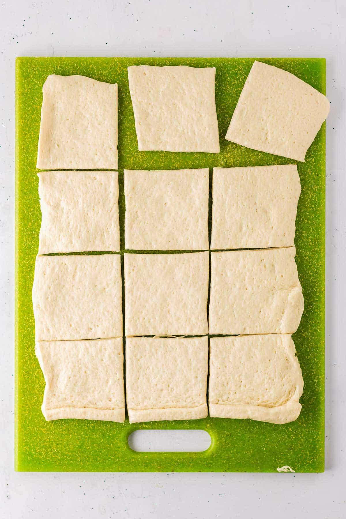 Rectangular pieces of raw dough are arranged on a green cutting board.