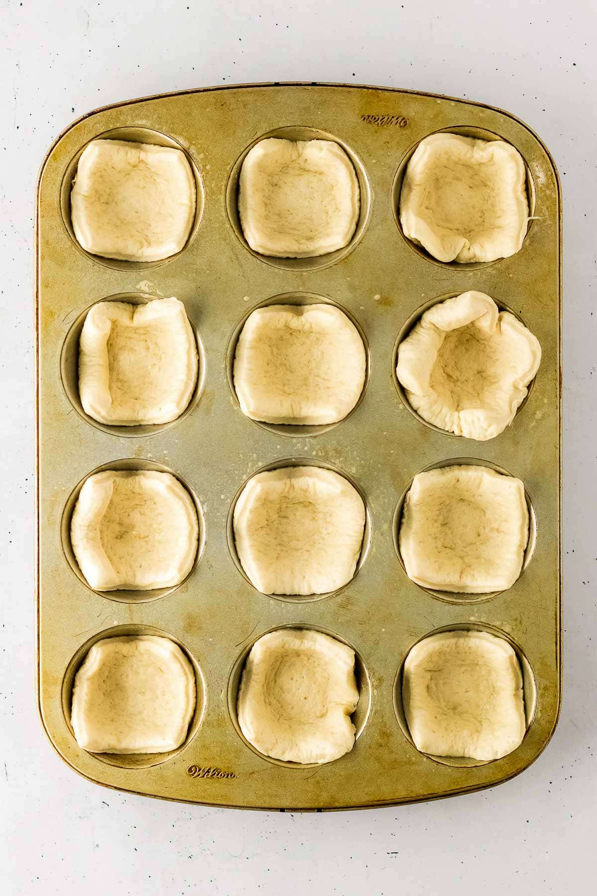 A standard muffin tin with twelve cavities, each lined with an uncooked piece of dough.
