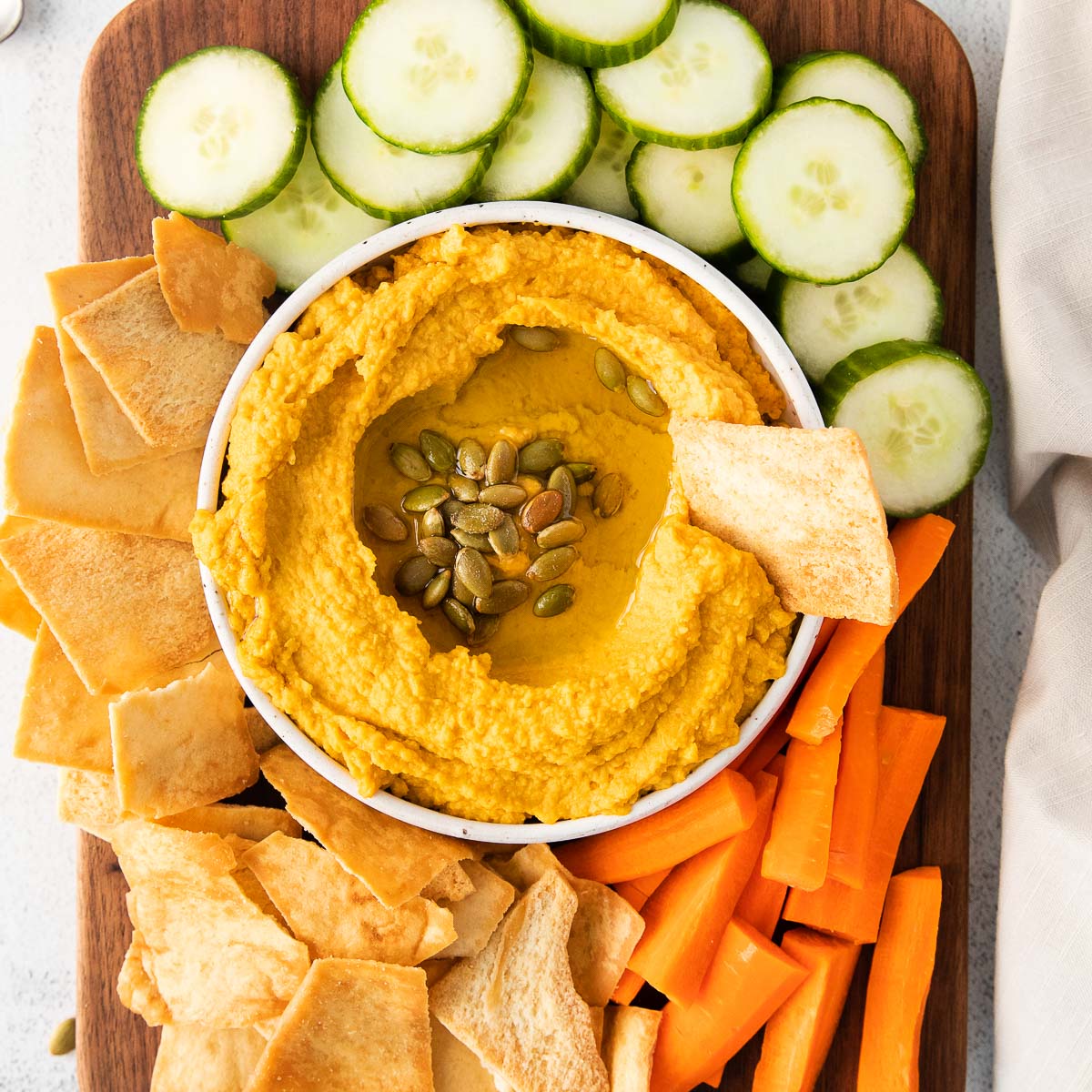 Next up, This Creamy Pumpkin Hummus is the perfect snack to serve with fresh veggies and crackers for holiday parties!
