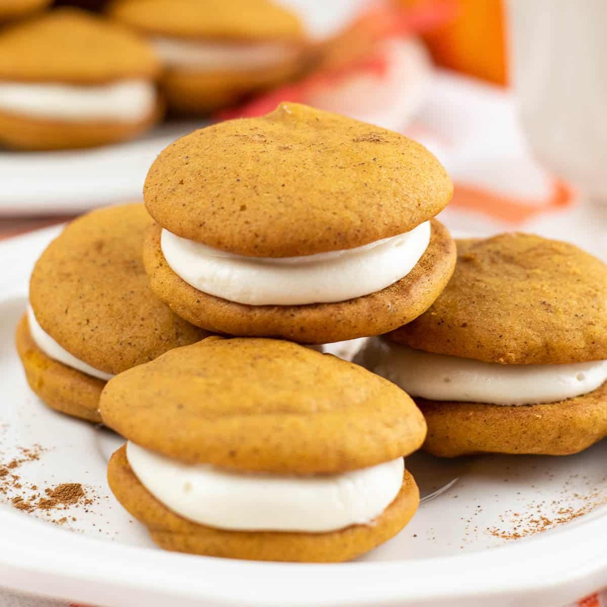 Soft, spiced Pumpkin Whoopie Pies sandwich a sweet cream cheese filling between two fluffy pumpkin cookies.