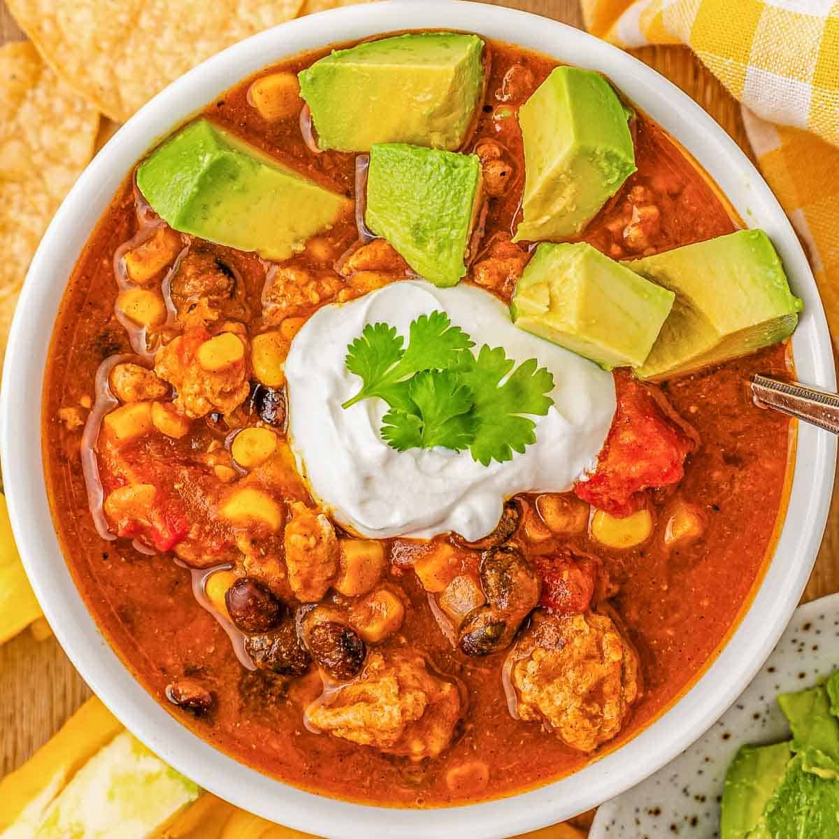 This 30-minute pumpkin chili combines ground turkey, pumpkin, peppers, tomatoes, black beans, and corn in a warmly seasoned broth.