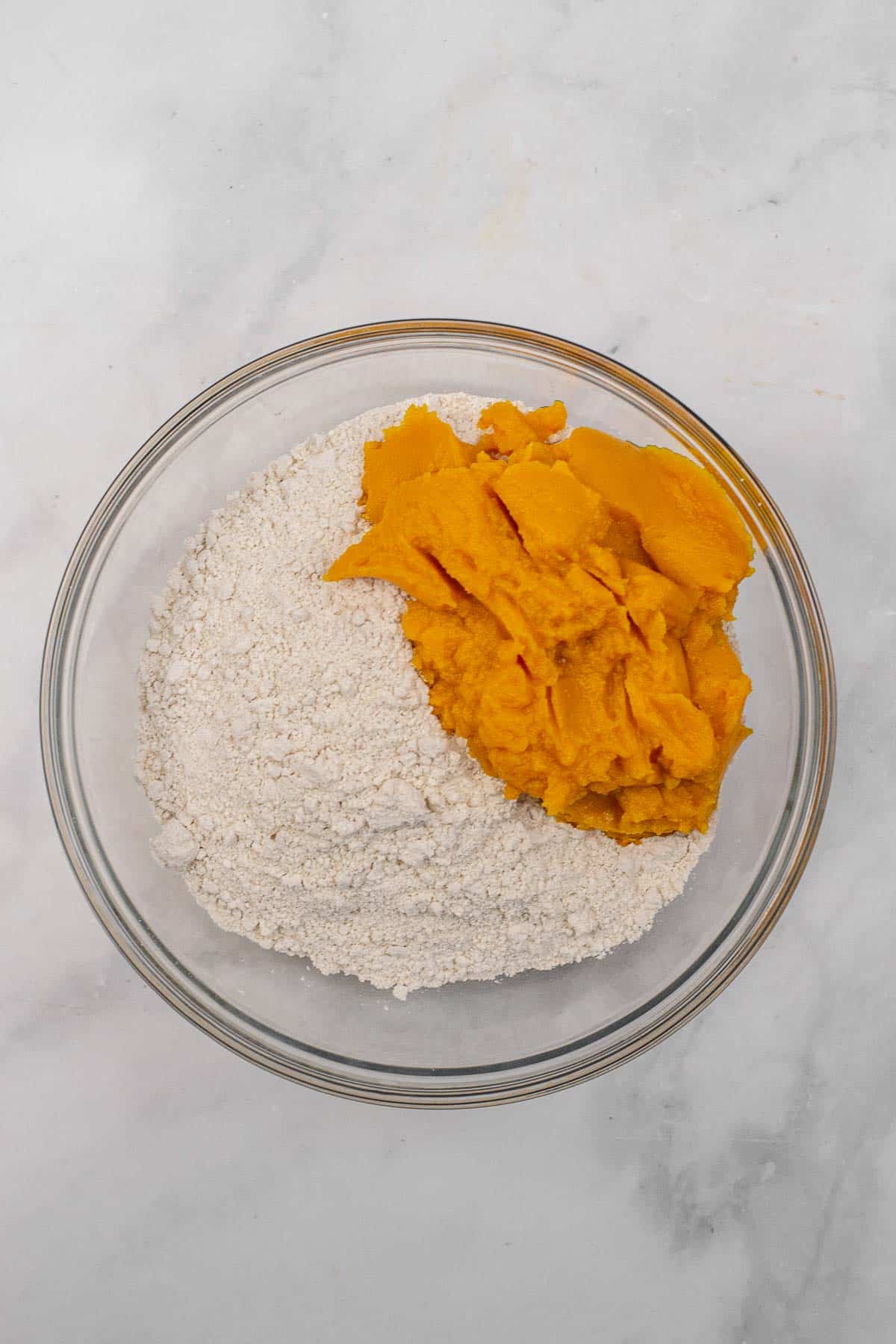 - In a medium mixing bowl, add the dry cake mix and the pumpkin puree and gently fold together with a spatula or wooden spoon. Just mix until their is barely any dry mix showing and try not to over mix it.15.25 ounce Spice Cake mix, 15 ounces pumpkin puree