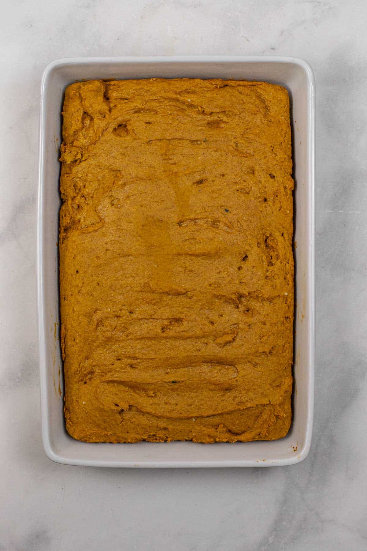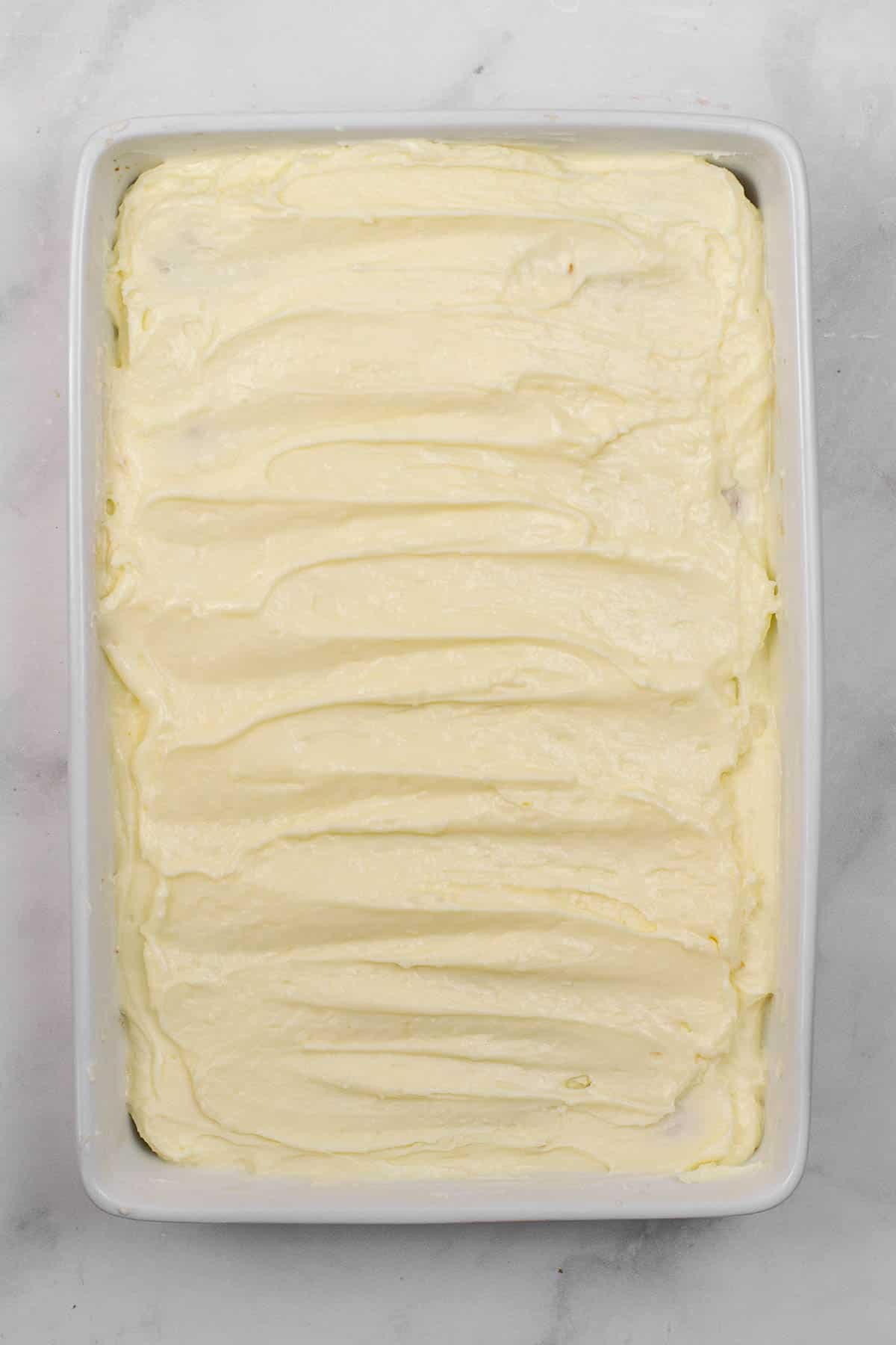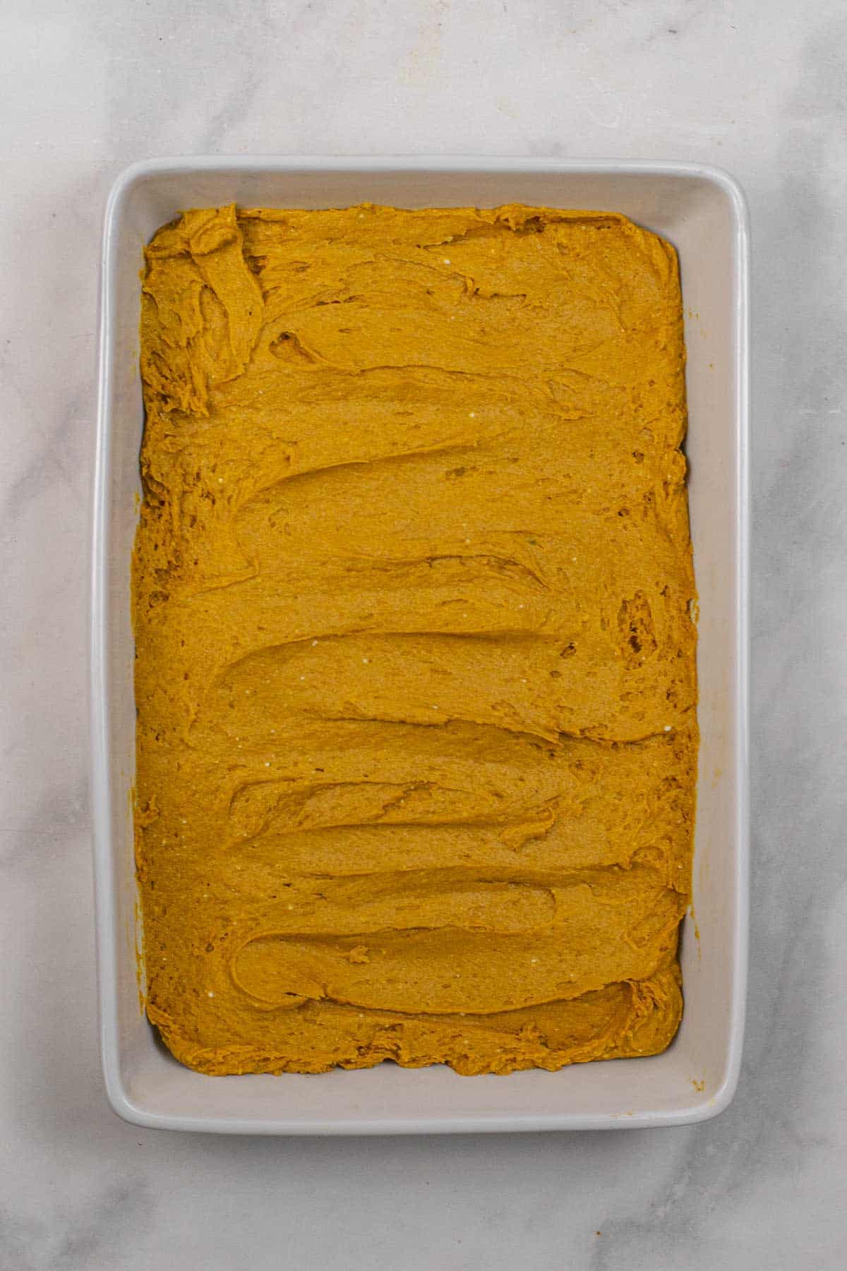 - Pour the batter into the prepared dish spread evenly.