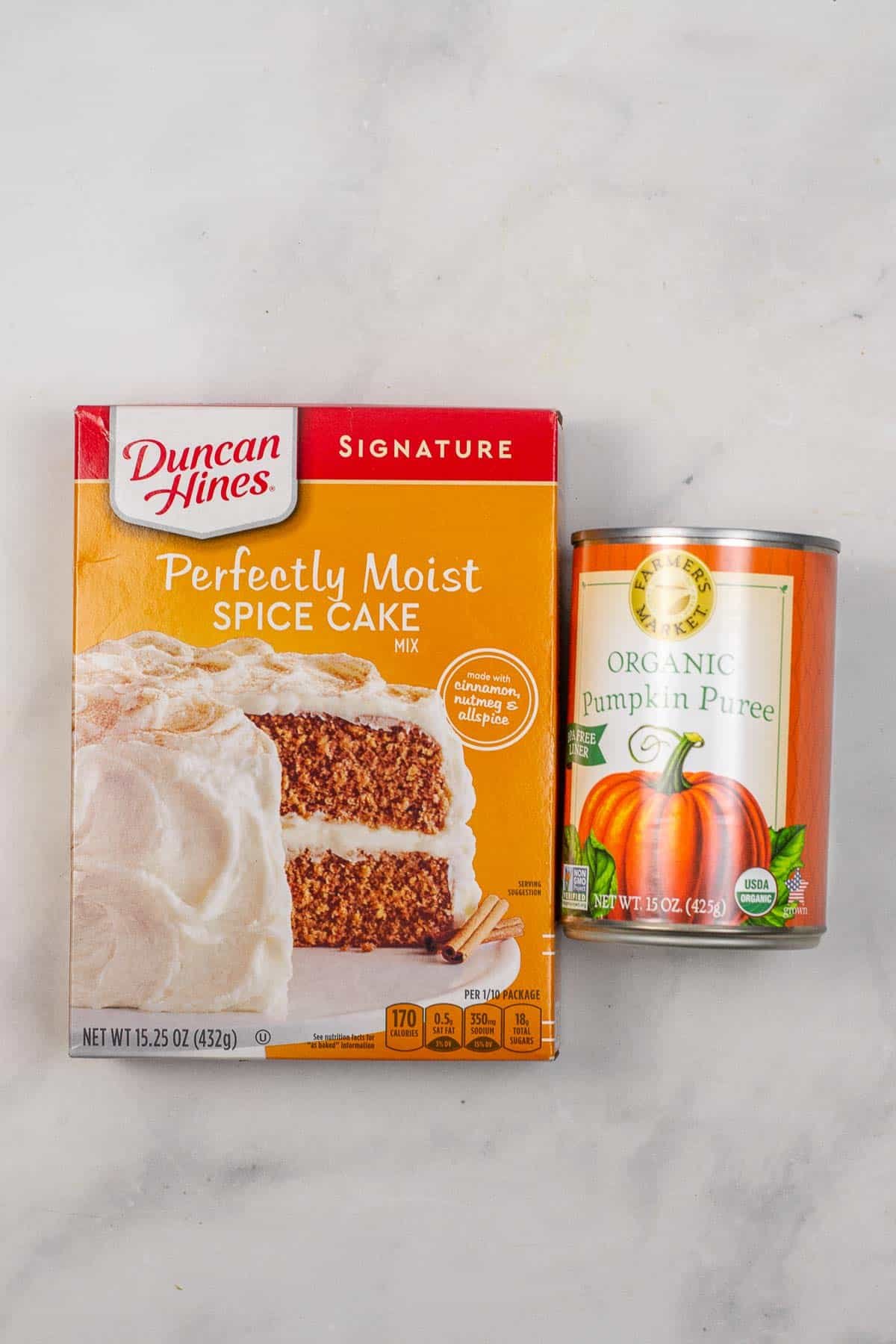 - Spice Cake Mix – I used a 15.25 ounce boxed cake mix. Use a yellow or white cake mix and add 2 tablespoons of pumpkin pie spice if you can’t find spice cake mix. You can also make it a gluten free cake mix too.