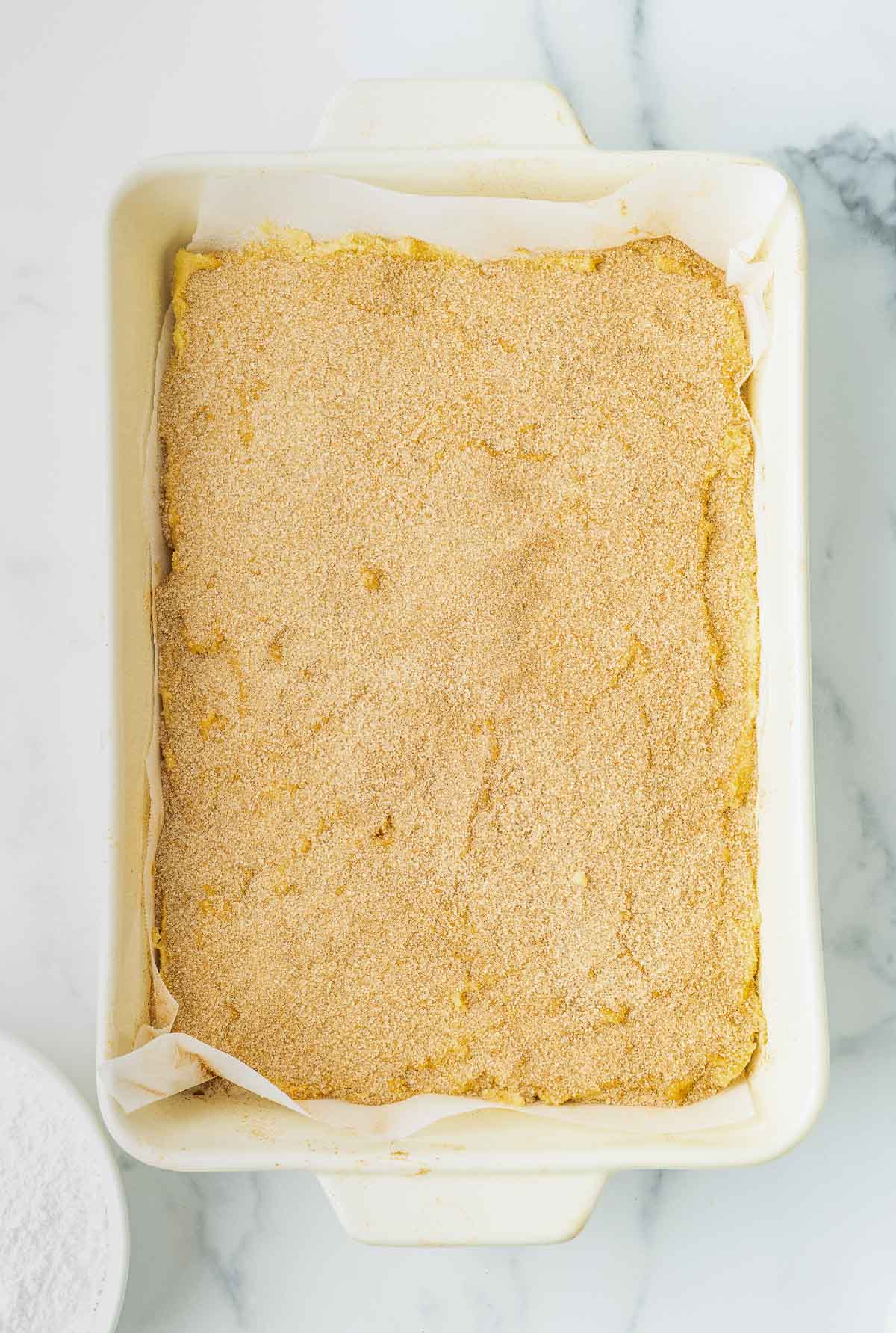 - Make the topping: In a small bowl, add the sugar and cinnamon and mix it together with a fork. Sprinkle over the top of the cookie dough.¼ cup granulated sugar, 2 teaspoons ground cinnamon