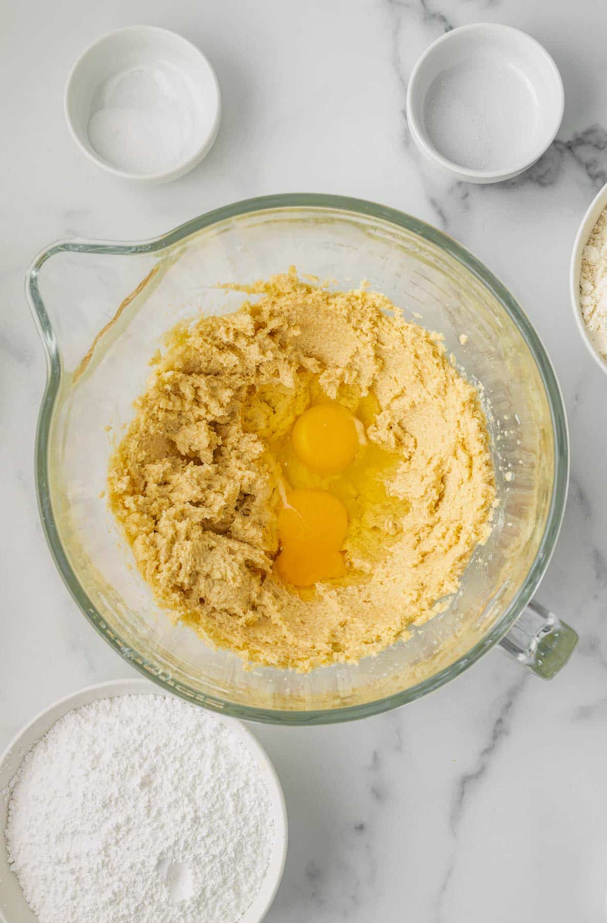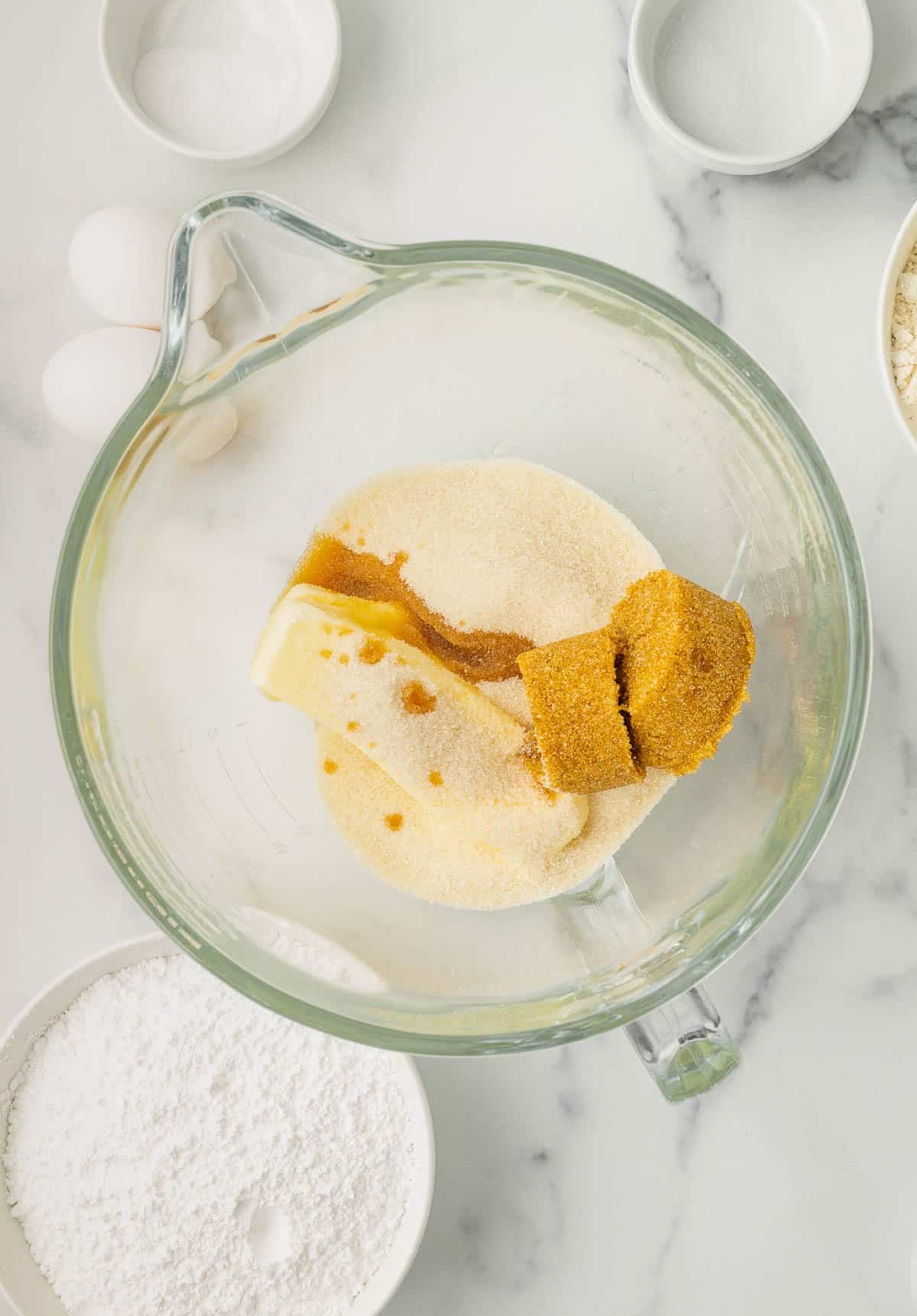 - In a large mixing bowl, add the softened butter, both sugars and vanilla extract and beat with an electric mixer on medium speed until creamy. (about one minute).1 cup unsalted butter, 1 cup granulated sugar, ½ cup light brown sugar, 1 teaspoon vanilla extract