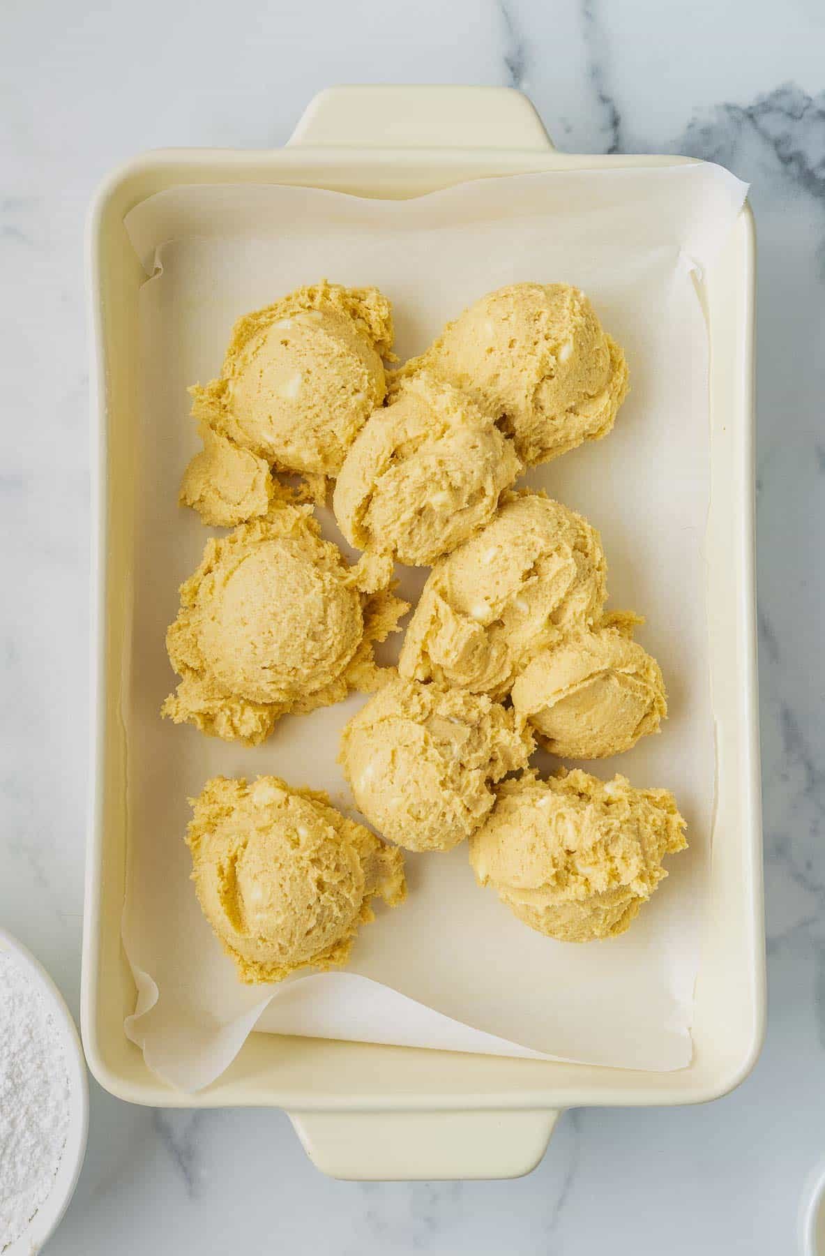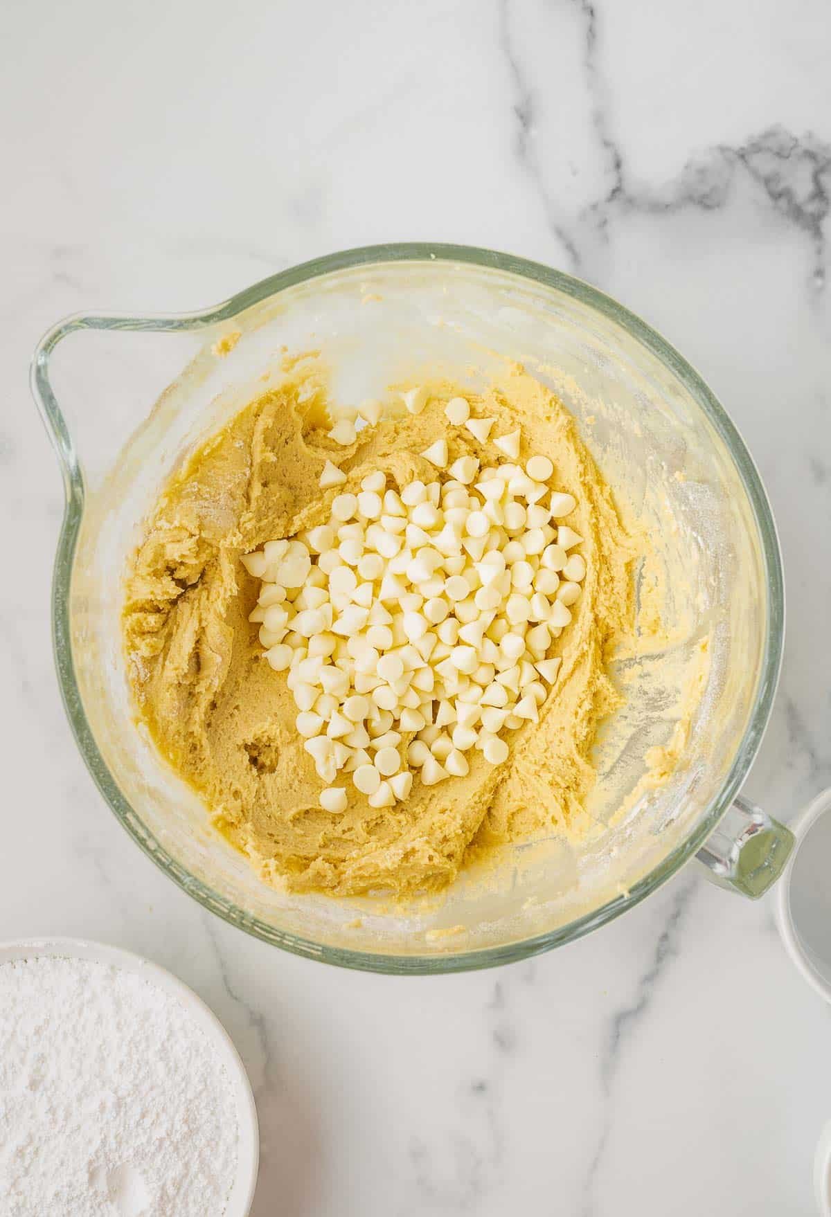 - Add the white chocolate chips and gently fold them into the dough.1 cup white chocolate chips