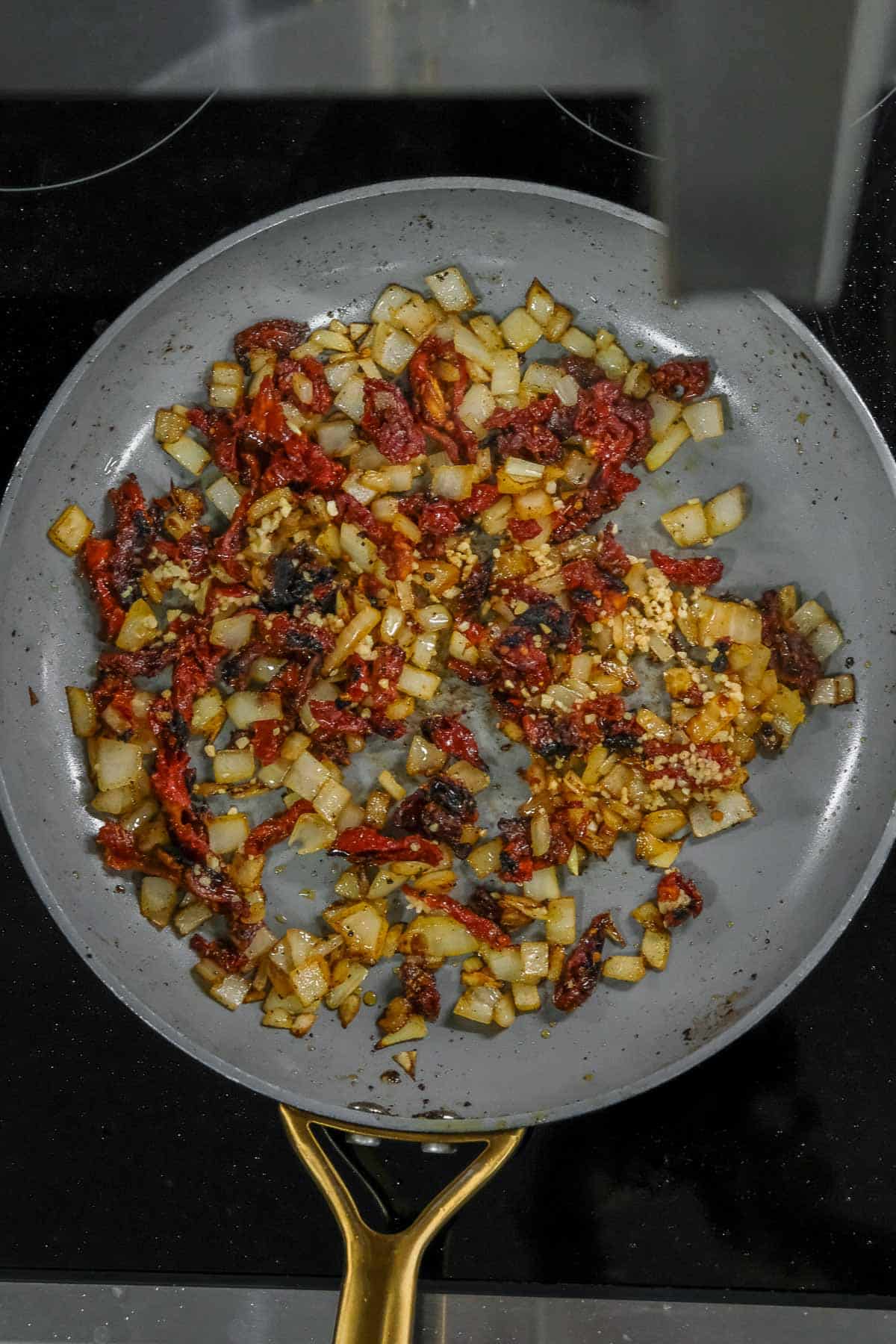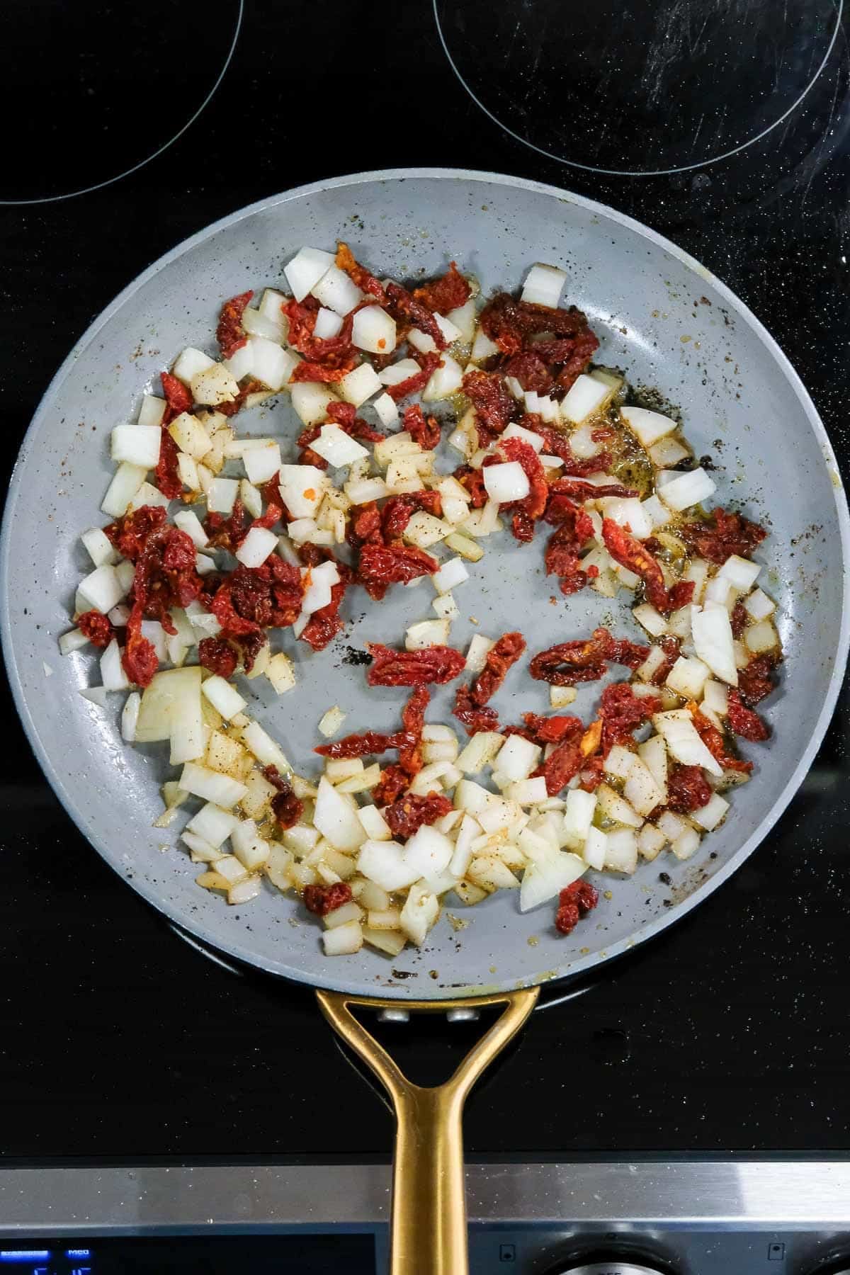 Step 5: Make the sauce. In the same skillet, add the onions and sun-dried tomatoes and sauté until the onions are translucent. Then add the garlic and sauté for an additional minute.