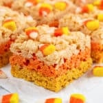 Give this layered candy corn inspired Halloween Rice Krispie treats a try. They are the perfect crispy treats for your next Halloween party. Made with Rice Krispie cereal, mini marshmallows, butter, and of course candy corn. This is a no bake Halloween treat that is great for the fall and Halloween season.