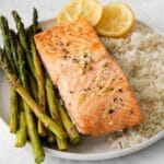 This easy Baked Salmon recipe is a simple sheet pan dinner to add a favorite vegetable, like asparagus, right alongside in the oven. Coated in a buttery lemon garlic sauce, this healthy and delicious recipe is the epitome of a no-fuss dinner!